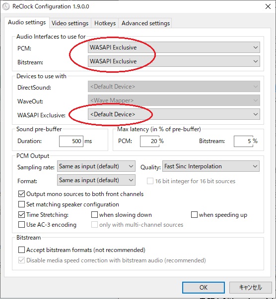フリーソフトのReClockをインストールして使います。フォーラム《ReClock 1.9.0.0》に行き、《Download ReClock here: https://www.redfox.bz/download/SetupReClock.exe》からダウンロードしてください。「CyberLink PowerDVD」は先にインストールしていなければなりません。私のはPowerDVD14で最新版18にかなり比べて古いのですが、もっと古くても対応しています。インストールしたら以下のようにWASAPIをセットして「OK」します。