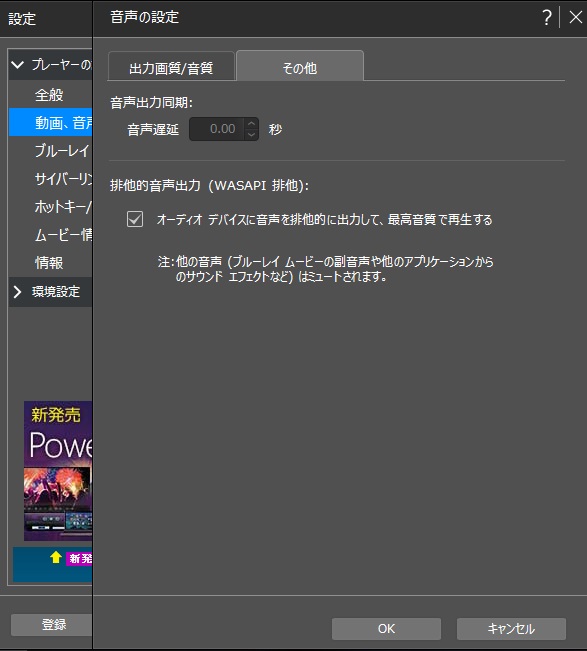 実はPowerDVD14の設定画面に以下の「排他的音声出力」選択があり、ワサピ排他モードになれるはずなのですが、実際には共有モードのようになってWindowsシステムによる音質劣化が防げません。排他モードになっていれば、他のプレーヤを起動しても音は聞こえませんし、PowerDVDの音量調整が出来なくなります。パソコンを買っておまけで付いてきた「PowerDVD BD for MouseComputer」には下の設定画面が無く、ReClockによるワサピ化も出来ません。