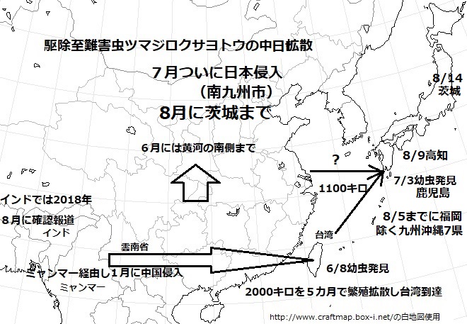 7月に書いた第614回「早くも日本侵入、駆除至難害虫に殺虫剤が無い」で掲げた白地図に手を入れました。今年1月にミャンマーから中国雲南省に侵入した後、2000キロを5カ月かけて繁殖拡散して台湾に至り、島伝いに1100キロを1カ月で鹿児島、さらに1月半で茨城までですから驚くべき拡散スピードです。世代サイクルが1カ月程度と短く、成虫のメスは卵千個から2千個を生む繁殖力の強さが脅威です。