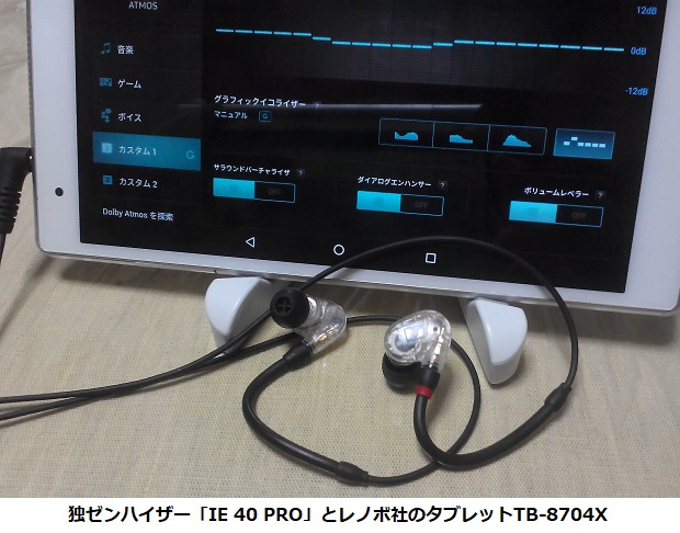 レノボ社のタブレットTB-8704Xに接続した写真を掲げました。直径10ミリの振動板によるダイナミック型、耳掛け型の透明クリアタイプで、色はブラックもあります。写真のタブレット画面はエージング200時間くらいの段階で施していたイコライジングを表しています。トランペットなどの金管楽器が活躍する領域をちょっとだけ下げています。イコライジングは『流行のハイレゾ再生、ソフト選択で音質劣化に』 [BM時評]に出しているゼンハイザーの最高級ヘッドフォン「HD800」のバランスに近づけるよう狙っています。鳴らし始めのころはかなり高音がうるさい感じがあり、下げ幅をもっと深くしました。