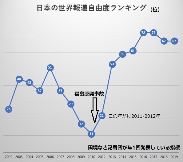 「国境なき記者団」が年1回発表している指標である「世界報道自由度ランキング」で日本がどう推移しているのかグラフにしました。ランキング上位の常連は北欧三国やオランダ、デンマーク、スイスといった国々であり、2019年の日本は67位でした。日本の前後を並べると65位ギリシャ、66位ニジェール、68位マラウイ、69位セーシェルなどです。グラフの通り、日本は東日本大震災と福島原発事故の前年2010年には11位にランクされていました。まずまず座り心地が良いこの位置から2013年に53位、2016年には72位まで墜落した大きな要因は政府発表に過度に依存した「大本営発表」報道であり、取材の基本を忘れた恣意性です。放射線被ばくを恐れて記者に「現場から直ちに引け」と命じつつ紙面には「100ミリシーベルトまでは怖くない」と出す整合しない報道姿勢などでした。