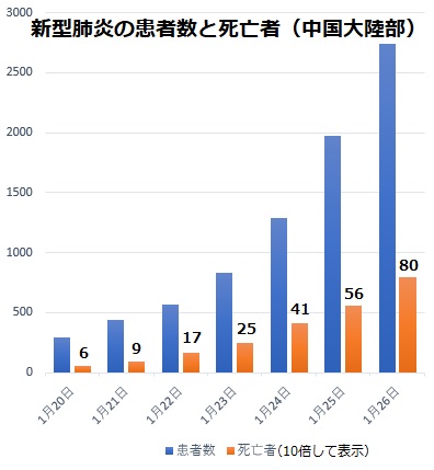 患者数と死亡者について、国家衛生健康委の発表データをグラフ化しました。20日の患者数は291例から始まっています。6日後の26日で2744例と10倍に近い急増です。人民日報の地域版で調べると26日に広東146例、北京68例、上海53例となり、3日前の23日に広東26例、北京10例、上海9例だったのと比べて劇的に増えています。北京で12例、上海で23例が市外からの移入者とされており、ほとんどが湖北省からでしょう。移入分を除いてもヒト-ヒト感染の強力な進行が疑われます。死亡者も20日の6人が26日は80人へ激増しました。