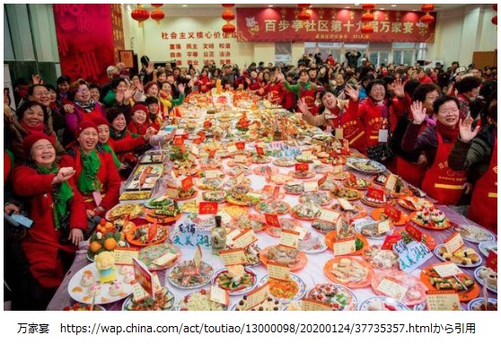 上の写真は2019年の「第19回万家宴」のものですが、今年もほぼ同様でしょう。一部分を写しているものの広大なテーブルにぎっしりの人波。今になって見れば空恐ろしくなる絵です。《武漢肺炎の第一線医師:大発生があります》(中国語)に掲載されていたのを引用しました。医師は現地病院の設備や装備品の深刻な問題点を指摘した後で、死亡者2名に62症例が確定しているのに武漢の保健当局は警戒を緩めたと糾弾します。問題の重要性と深刻さを認識せず、各家庭から料理を持ち寄る40000人の宴会をやってしまいました。
