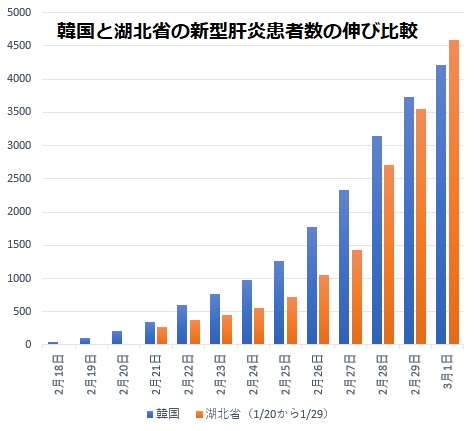 韓国で新型コロナウイルス肺炎患者数が急激に増えて止まりそうにありません。4千例を突破した機に武漢市を含む中国湖北省と比べると人口は共に5千万人台であり、よく似た患者数激増は今後の危険を予測させます。韓国の患者数4212例を3月1日現在とすると、湖北省が4586例になったのが1月29日です。公表されている1月20日からのデータと並べて以下にグラフを作りました。