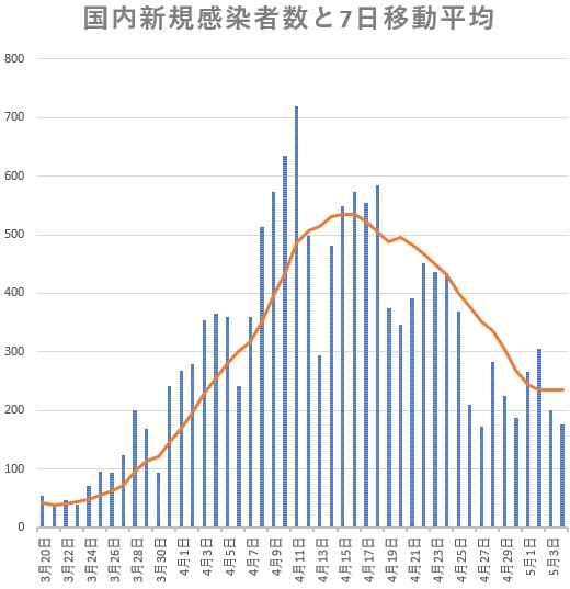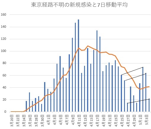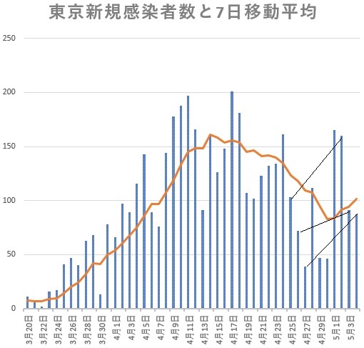 緊急事態宣言の延長が決定の4日、緩やかながら順調に減りつつあった新型コロナウイルス感染が東京で反転増加が確認されました。最大感染地での増加で全国の感染者数も減少から横ばいに転じ、宣言緩和は遠のきます。1週間サイクルの新規患者発生数の癖を消す7日移動平均で見ると、4月7日の宣言から1週間後に東京はピークに達し、宣言2週目は緩やかな減少、3週目に入ってかなり急に減っていたのに、5月に入って反転増加してしまいました。東京の状況からグラフで見ましょう。