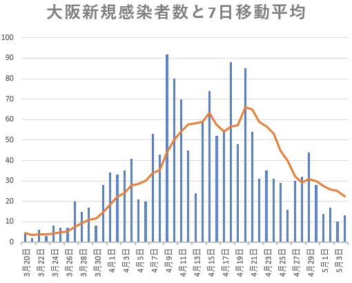 大阪のグラフを見ると5月に入り感染減少傾向は緩やかになっても確実です。3月並みの1日1桁発生までもう少しであると考えられます。全国的には北海道が第2波襲来で騒いでいる以外は大きな揺れはありません。