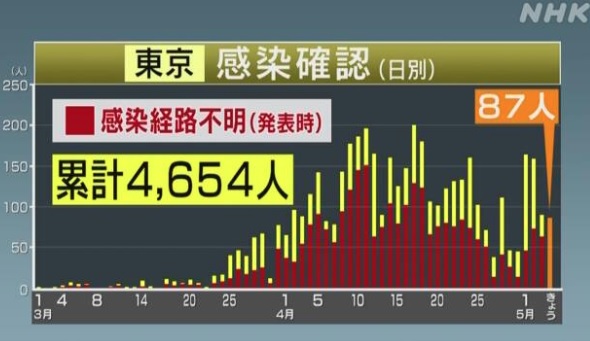 5月に入って大きな院内感染で感染が増えた形ながらも、反転増加の基調を決めたのは感染経路不明者が増えたからであると示しています。直近の3日間、1週前の対応する曜日と細線で結ぶと同じような増加傾向にあると分かります。実は首都圏で東京に次ぐ神奈川県でも同様の3日間増加が見られており、東京単独ではなく広い範囲での反転傾向である可能性が高くなっています。東京が元の減少傾向に戻せるか、かなりの窮地にあります。