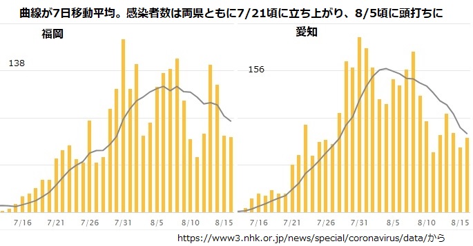 福岡と愛知は独自の緊急事態対応を訴えるほど危ぶまれた県ですが、現時点では収束の足取りが明らかです。いずれも7/21前後に感染が本格的に立ち上がり、8/5前後に患者発生が頭打ちになっています。県単位というコミュニティで見れば全国的な第一波で観察された半月での社会防衛パターンが健在と知れます。潜伏期間を考えると、当該地域社会で流行が顕著になると直ちに自発的な自粛が起きているようです。他人に迷惑を掛けない、思いやるマナーが浸透している日本人の特性、確固たるものです。政府の新型コロナ対応失格が世論調査で明確になっているのに、大衆レベルで大流行を自発的にブロックしてしまうのですから、日本政府は楽です。