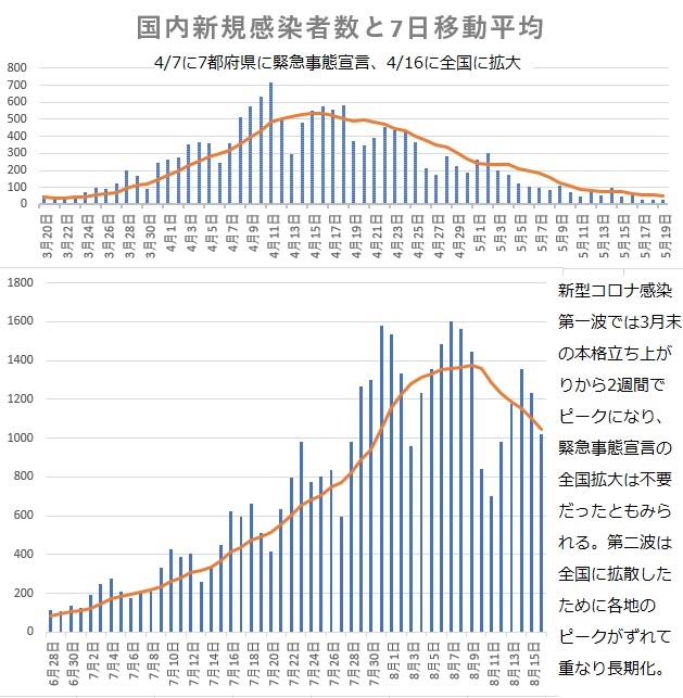 新型コロナ感染第二波は8月上旬にピークを過ぎて収束に向かっていると見られます。第一波では半月で頭打ちになったのに第二波は1カ月を要しましたが、各県ごとには半月で頭打ちの傾向は変わらず、全国に拡散したためにピークがずれて重なり合ったようです。地域社会防衛はやはり半月で起動したと考えられます。首都圏など大都市周辺の場合は県外からの影響が考えられ、一本調子で減らないケースもあります。第一波と第二波をまとめてグラフにしました。曜日による感染者数変動をならして観察する「7日移動平均手法」は4月の拙稿第633回「緊急事態宣言1週間で新型コロナは頂点、減少へ」で開発したもので、現在では内外で広く使われています。
