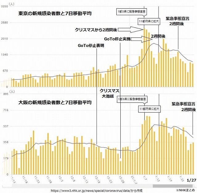 新型コロナウイルス感染者急増で出された年明けの緊急事態宣言が効果を発揮し始めて政府はほっとしていますが、12月からの成り行きを検証すると政府が犯した罪は大きいと言わざるを得ません。GoToキャンペーンの停止は14日発表ながら実施が28日まで延ばされたために事態の緊急性は希薄と国民に受け止められました。間に入ったクリスマス前後で各地の人出が増えたと伝えられ、新型コロナ流行初期から言われてきた2週間後、年明けに感染爆発状態を危惧させる患者大発生を起こしました。GoTo停止は発生高止まりくらいの効果しかなくて緊急事態宣言が効くことになりました。東京と大阪の感染者発生をベースに経緯を追ったグラフを作りました。