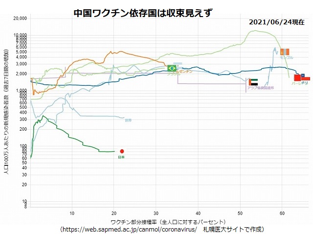 欧米のワクチン入手が難しくて中国ワクチンに頼っている南米チリや中東のバーレーン、それにモンゴルが接種率60%になっても抑制効果がはかばかしくありません。人口100万人あたり週間新規感染者数が2000人前後というのは大変な流行です。2回目あるいは3回目を接種した「完全接種率」でも5割を超えているのですから、中国ワクチンの効能に特大の疑問符が付きます。中国ワクチンを認めたWHOの責任問題にもなります。アラブ首長国連邦も3カ国に準じますし、部分接種3割を超えた南米の大国ブラジル、アルゼンチンが上記国と全く同じ推移をたどっているのが不気味です。