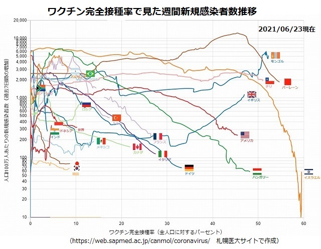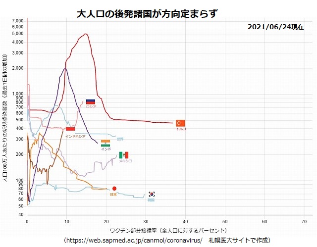 後発諸国で接種3割超えのトルコは中国ワクチン依存度が高く人口100万人あたり週間新規感染者数が400人台で、改善の兆しがあまり見えません。巨大人口のインドは国全体が変異株流行ではなく、接種2割に届く段階で感染者数200人台に減り、規制緩和措置が言われています。米国が支援しているメキシコは100人台を上下しています。自国産ワクチンを持つロシアが800人台に急増中です。政府不信がワクチン不信にもつながって接種率が伸びません。