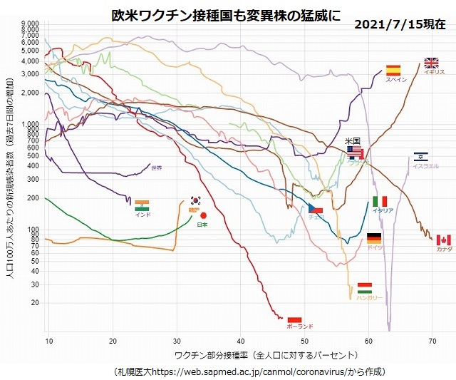 新型コロナワクチン部分接種率を職域接種を含めると国民の約35%まで押し上げた日本、東京五輪を直前にしてワクチンの予防効果を期待したいところですが、中国ワクチンより予防効果が高い欧米ワクチン接種先行国でもインド変異株(デルタ株)の猛威で感染者数は反転上昇しています。札幌医大フロンティア医学研サイトでワクチン接種と新規感染者数の推移グラフを作成すると、部分接種率が50%に達しても猛威は免れないようです。一方、ワクチン接種が進んでいると死者や重症者が大幅に減っているので、それを頼りに感染激増の英国が規制大緩和に踏み切ろうとしています。インフルエンザ並みに扱いたいのです。