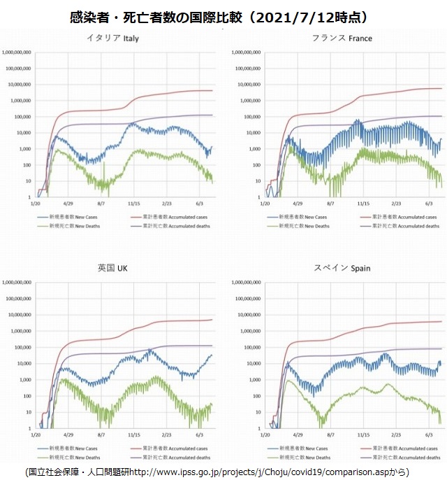 旧植民地インドとの大量の往来でデルタ株にすっかり置き換わった英国は人口100万人あたり1週間感染者数が4000人に迫り、ワクチン接種では追いつかなくなっています。英国のアストラゼネカワクチンはファイザーやモデルナに比べてデルタ株への予防効果が落ち、しかも副作用の心配から子供には打てません。英国の大緩和は「子供をモルモットにするもの」との批判が出ています。しかし、次の国立社会保障・人口問題研究所の「感染者・死亡者数の国際比較」グラフで分かるように、1日の死者が1000人にも達していた悲惨な状態からワクチンのおかげで10人前後に落ち着いています。