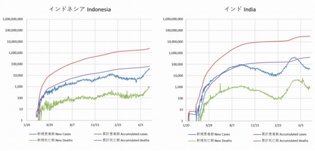 同じグラフを現在、大流行で邦人の緊急帰国が相次いでいるインドネシアと、インドについて掲げます。部分接種率がインドネシアは10%台半ばながら中国ワクチンが主体で効果は薄くて死者急増、8月からファイザーワクチンを大量購入すると発表しました。インドは1日に1500万回接種と、日本の10倍の大量接種を巨大な国土全体で進めています。部分接種率が20%台半ばに進み、かつての大流行から日本で言う「ステージ3」にまで戻しています。インド変異株と言っても大きな国なので全土で流行しているわけではありません。