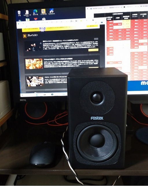 これまでパソコンには上の写真で奥に見えるJBLの通称カタツムリを接続、とても音楽を聴ける品位はありませんが、「スピーカを買うとアンプも必要だし」と昔の常識に囚われていました。アンプ組み込み小型モニタースピーカに優秀な製品が出ているのです。写真手前のFOSTEXのアクティブスピーカー「PM0.4c」はアマゾンで1組26721円で買えて、距離1メートルくらいで聴く分には申し分ありません。幅13センチ、高さ22センチ、壁の前にあるパソコンラックの棚に押し込んでいるので低音が出すぎ、背後に向いたバスレフポートにスポンジを差し込み殺しているほどです。10センチのスピーカですから大空間で鳴らすのは無理ながら、私の使い方なら高音部ソフトドームの精緻さもあってほぼ万能です。