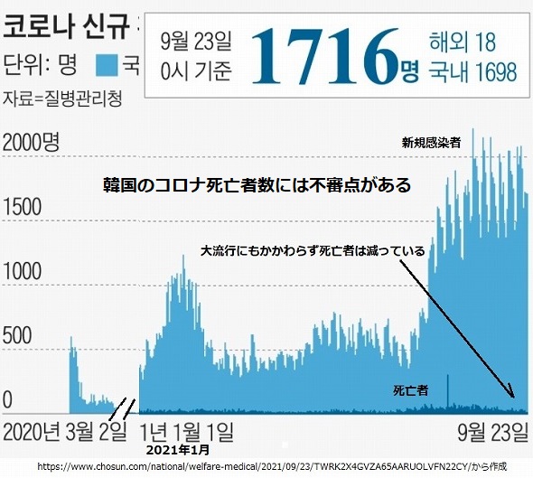 韓国のコロナ死亡者は昨年、英国BBCが報じた《新型コロナウイルスによる本当の死者数は? 各国の超過死亡を見る》でも《韓国 (2月01日 - 3月30日)韓国の死者数は平年より 5% 高く、平年より 2400 人が多く死亡した。政府発表によるCOVID-19死者数「163」、その他の超過死者数「2215」》と疑念が呈されています。