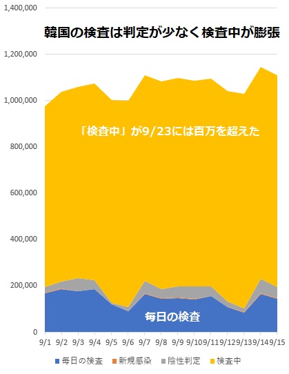 死亡者が少なく「K防疫」の優秀さを誇る韓国の新型コロナ対策は「砂上の楼閣」と疑われます。23日、韓国政府が発表する新型コロナ「検査中」の件数が日々に増えて百万を突破しました。大流行中の現在で1週間分の検査数を束ねた数に相当、感染数の信頼性に大疑問です。以前から疑惑を持たれていた死亡者数の不自然さも歴然としてきました。2014年に《奇怪な韓国の闇、民衆は達観する「愚政府・愚役人」》を書きましたが、現在のムンジェイン政権の姑息な体質からすると闇はもっと深そうです。韓国政府の統計数字を9月前半に記録した結果をグラフ化したので異常ぶりをご覧ください。