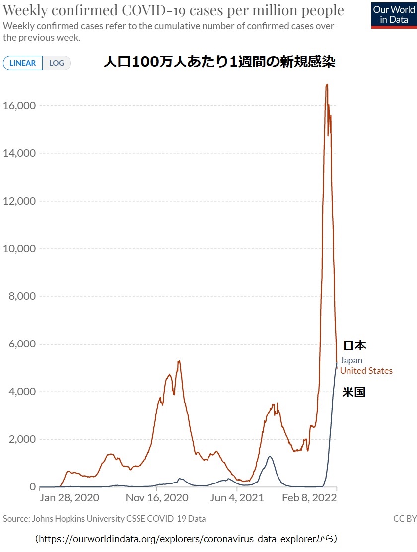 欧米で新型コロナ・オミクロン株の勢いが衰えていく中、ちょうど流行ピークに達した日本が人口100万人あたり1週間の新規感染で米国を上回る珍しい事態が発生しました。昨年初めからの流行で常に桁違いの患者発生差があった日米間が逆転しました。米ジョンズホプキンス大学の集計による、ourworldindata.orgのグラフを掲げます。