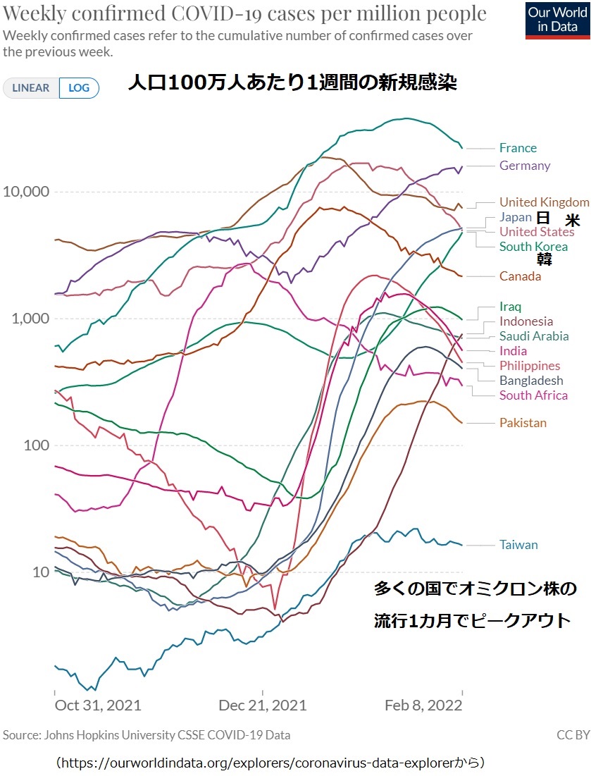 日本では毎日10万例に迫る新規感染が続き、NHKの《「まん延防止」13都県延長へ 高知も適用 来月6日まで 首相表明》で《岸田総理大臣は記者団に対し「オミクロン株とのたたかいは今まさに正念場を迎えている」と述べました》とあるのですが、東京と大阪の二大都市で流行拡大が足踏み状態になっています。以下にある諸国の傾向から推測して、今後は減少へ転じると期待されています。