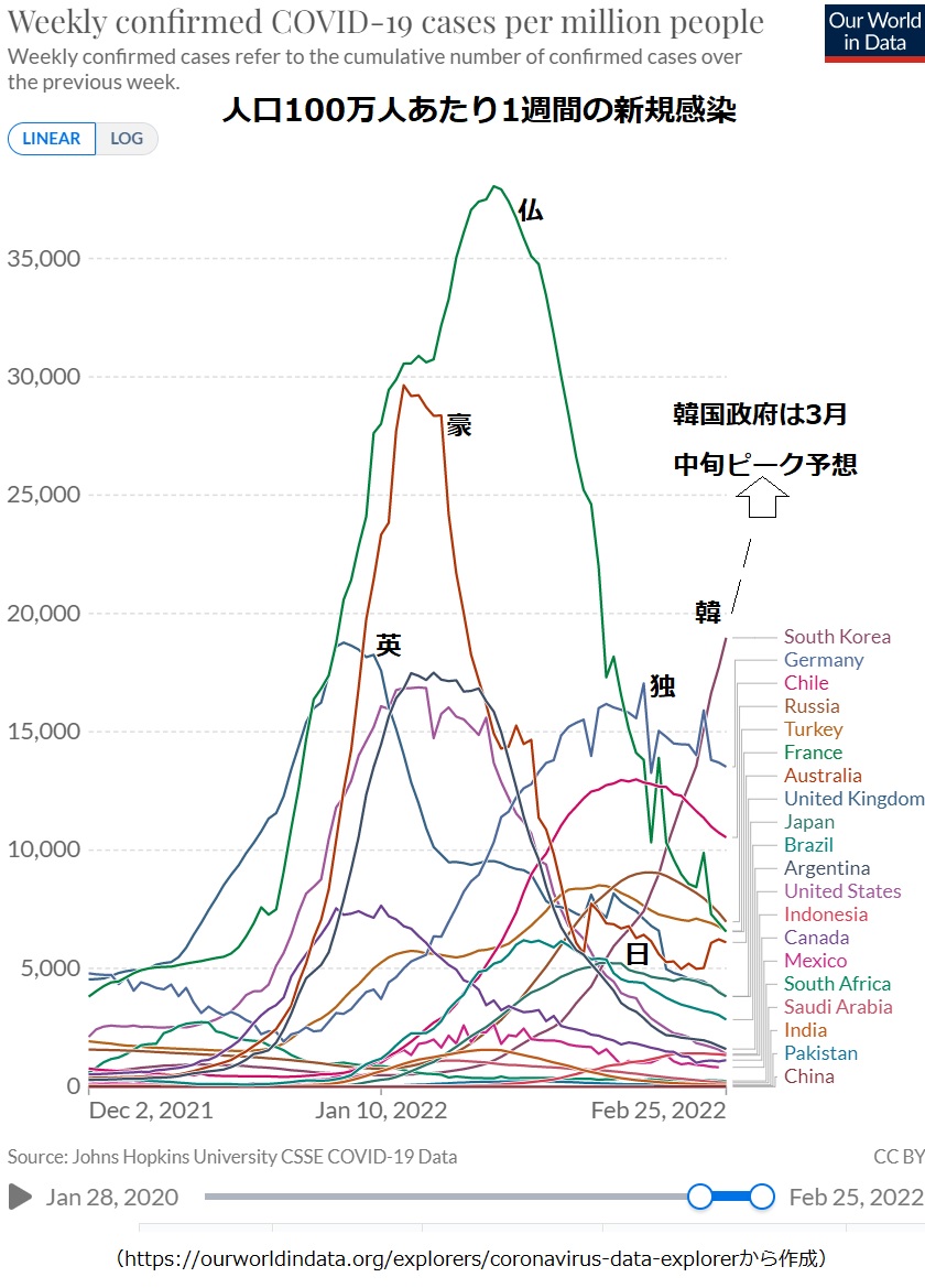 ourworldindata.orgが米ジョンズホプキンス大学の集計で作っている、「人口100万人あたり1週間新規感染のグラフ」を昨年12月から2月25日まで掲げました。G20を中心にした諸国の動きを表示しています。昨年末から英国、オーストラリア、フランスと巨大なピークを形成、最近まではドイツが世界一でしたが、23日に韓国が抜き去りました。