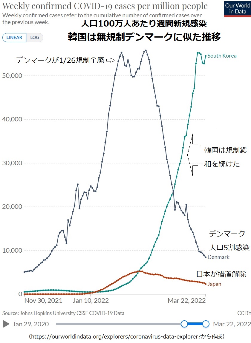 韓国で人口の2割が新型コロナ感染に至るも、これがピークなのか確信が持てない状況です。防疫措置はほとんど解除し多くのマスメディアから「無政府状態」と批判され、規制全廃したデンマークに似た推移をたどっており人口の5割感染があり得ます。22日の新規感染確定者は49万881人であり、人口が2.5倍ある日本なら1日120万人超えという途方もない数字です。これまで「K防疫」を自慢していた文在寅政権は強力なオミクロン株の前で任期末を迎えて全く無気力になり、国民もこれまでの法的に強いられた我慢から解き放たれて好き勝手を始めているようです。「ourworldindata.org」のグラフで経緯とこれからの行方を考えましょう。