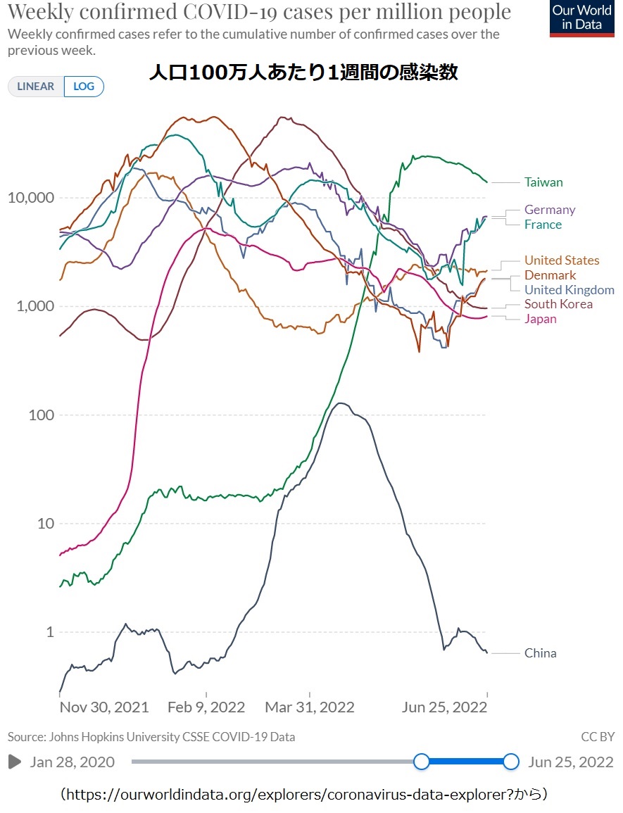 世界の状況を見れば、日本の微増はまだ僅かな変化だと知れます。ドイツやフランスなど欧州主要国は6月に入って感染が倍増です。1月末で新型コロナ規制全廃に踏み切ったデンマークは国民への感染が進み、現在は感染者累計が国民の55%にも達しています。5月末には集団免疫が期待できると思わせる人口100万人あたり1週間感染数「380」まで下がりましたが、現在は日本の2倍以上に増えています。フランスも感染者累計が国民の45%もあります。