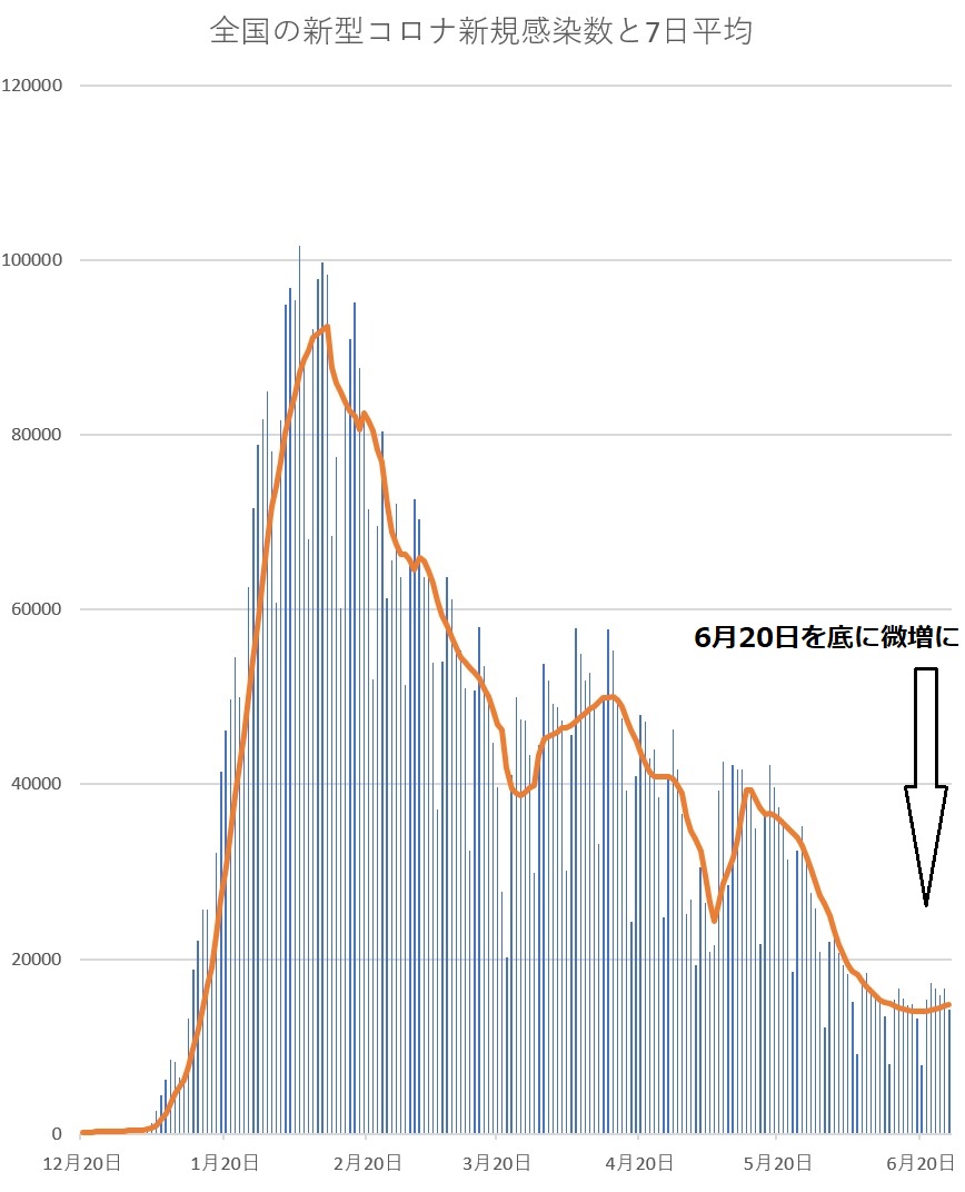 23日付の第88回新型コロナウイルス感染症対策アドバイザリーボードは「新規感染者数について、全国的には一部の地域を除いて減少傾向が続いているが、その減少幅は鈍化しつつある。地域別に見ると、減少を続けている地域もあれば、横ばい又は増加の兆しが見られる地域もある」としていました。増加の兆しが現実になりました。