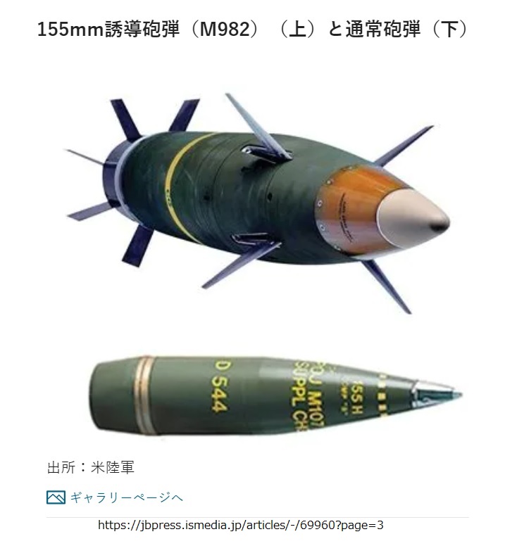 《しかし、米・独・仏国が供与する新型の口径155ミリ火砲と砲弾(M982弾)は、新型で、約40〜70キロ先まで射撃することができる。これまでの火砲と異なり誤差が少なく命中精度が良い。CEP(半数必中界)は約5〜20メートルという。GPS誘導機能があるのだ。無人偵察機と連携させれば、ソフトターゲットを効率よく破壊・殺傷することができる。40キロ以内を飛翔する、ミニチュアミサイルと言ってもよいくらいだ》