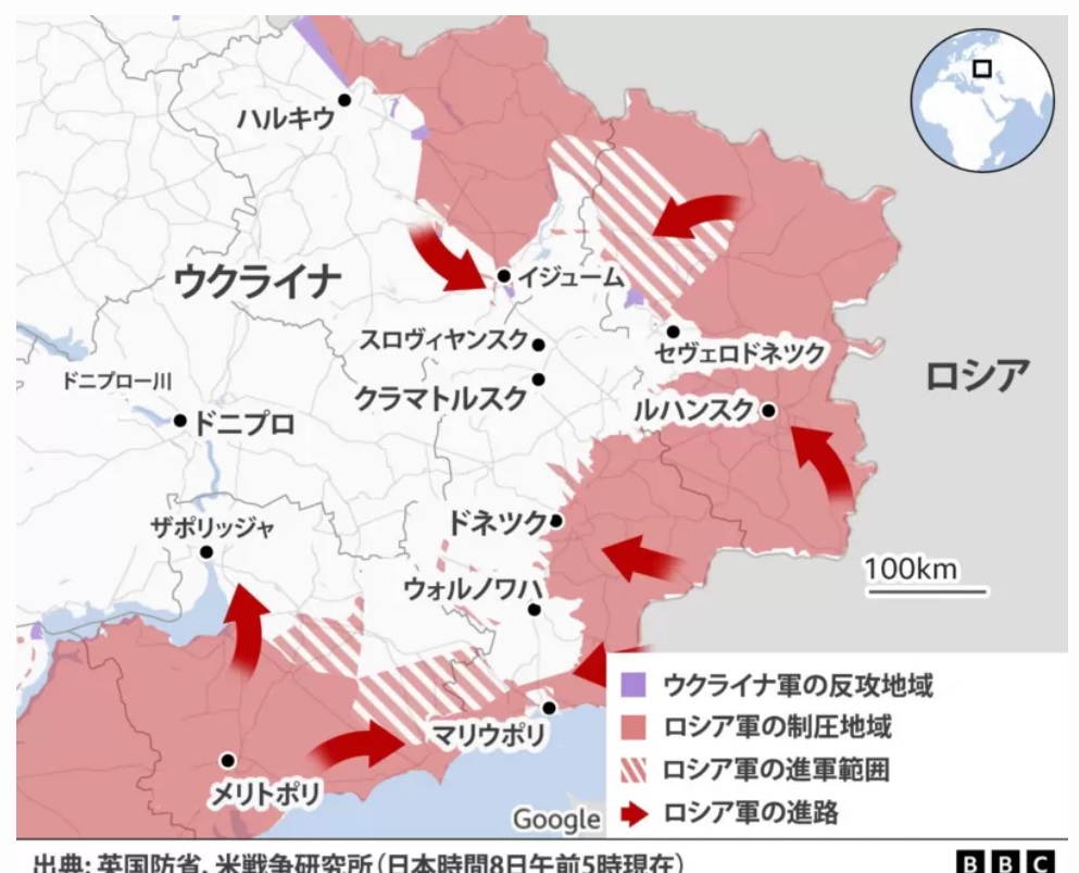 北の首都戦線から大量のBTGを引き揚げたロシア軍は東部ドンバス地方占領を目指しますが、1日で数キロとか進軍速度は極めて遅くなっています。北部ではベラルーシ国境からの補給ラインが非常に長く延び、燃料や食料すら欠く事態になったために今度は補給部隊と離れない、臆病な動き方です。また、ウクライナ軍は東部に最精鋭部隊を置いてロシア進撃を阻んでいます。