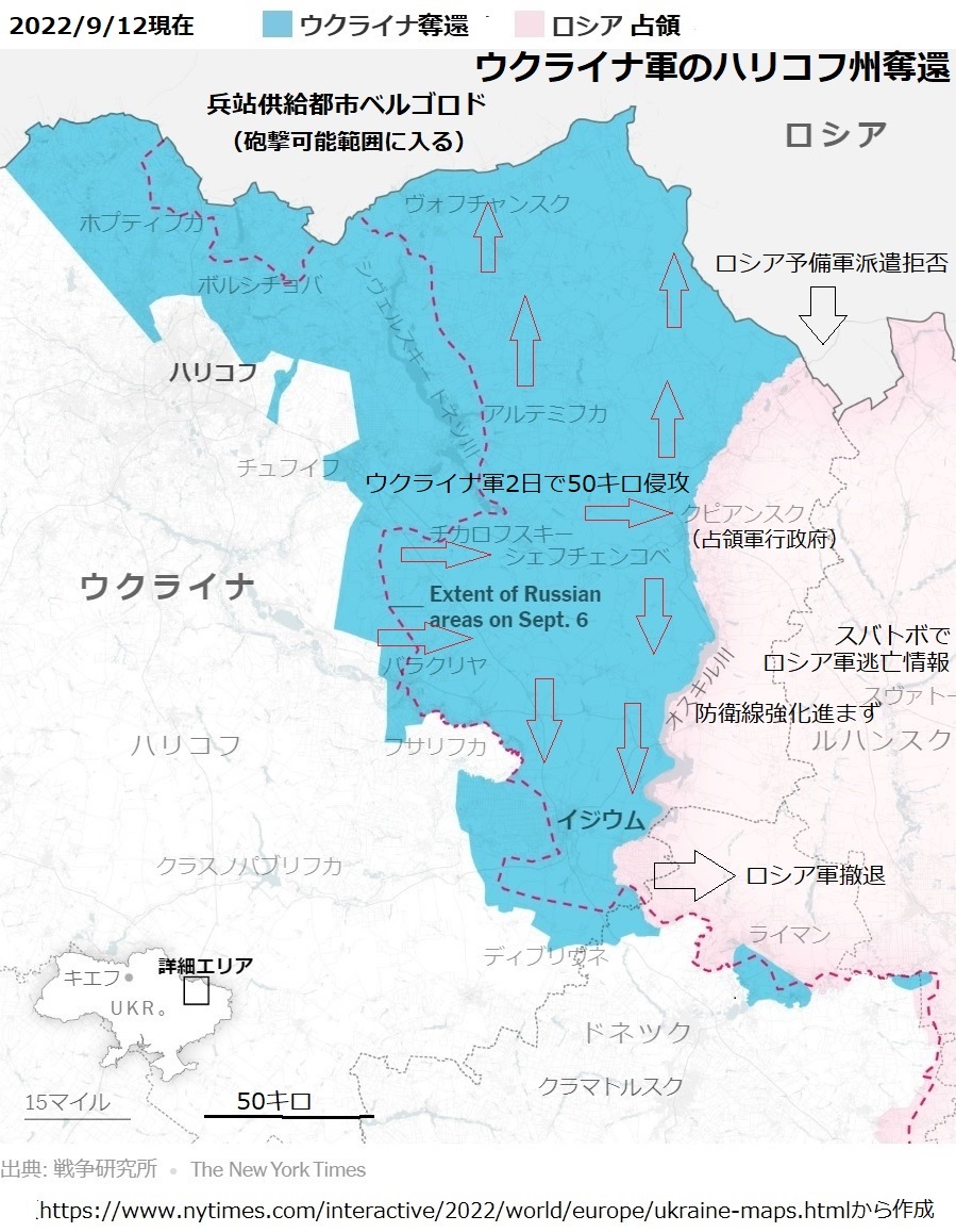 戦況図の元図を作った米国の戦争研究所による《ロシア攻勢作戦評価、9月12日》(英語)は注目すべき報告であふれています。要約しながら記します。