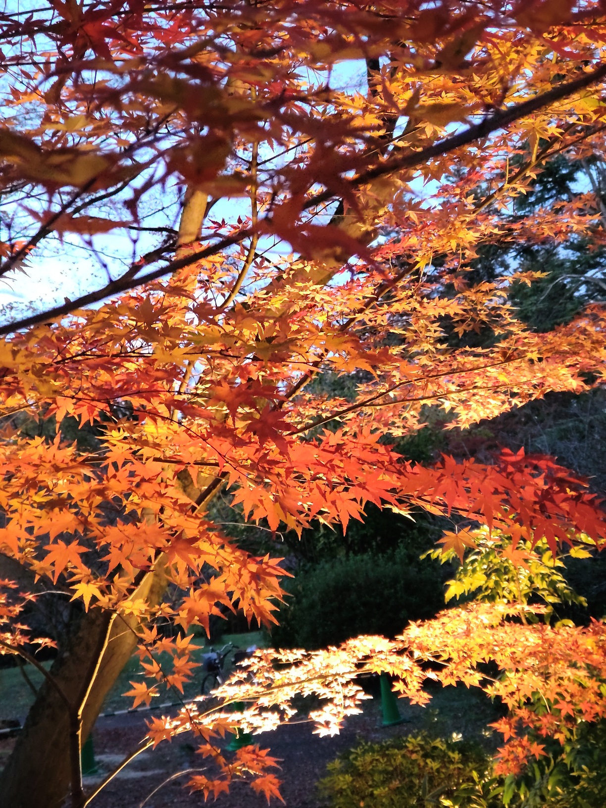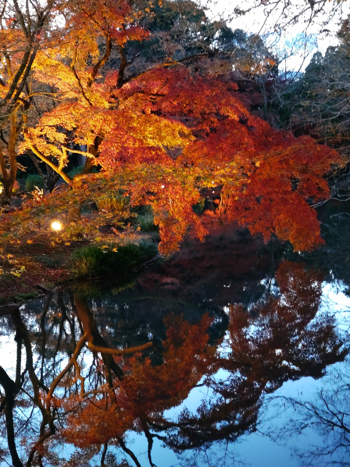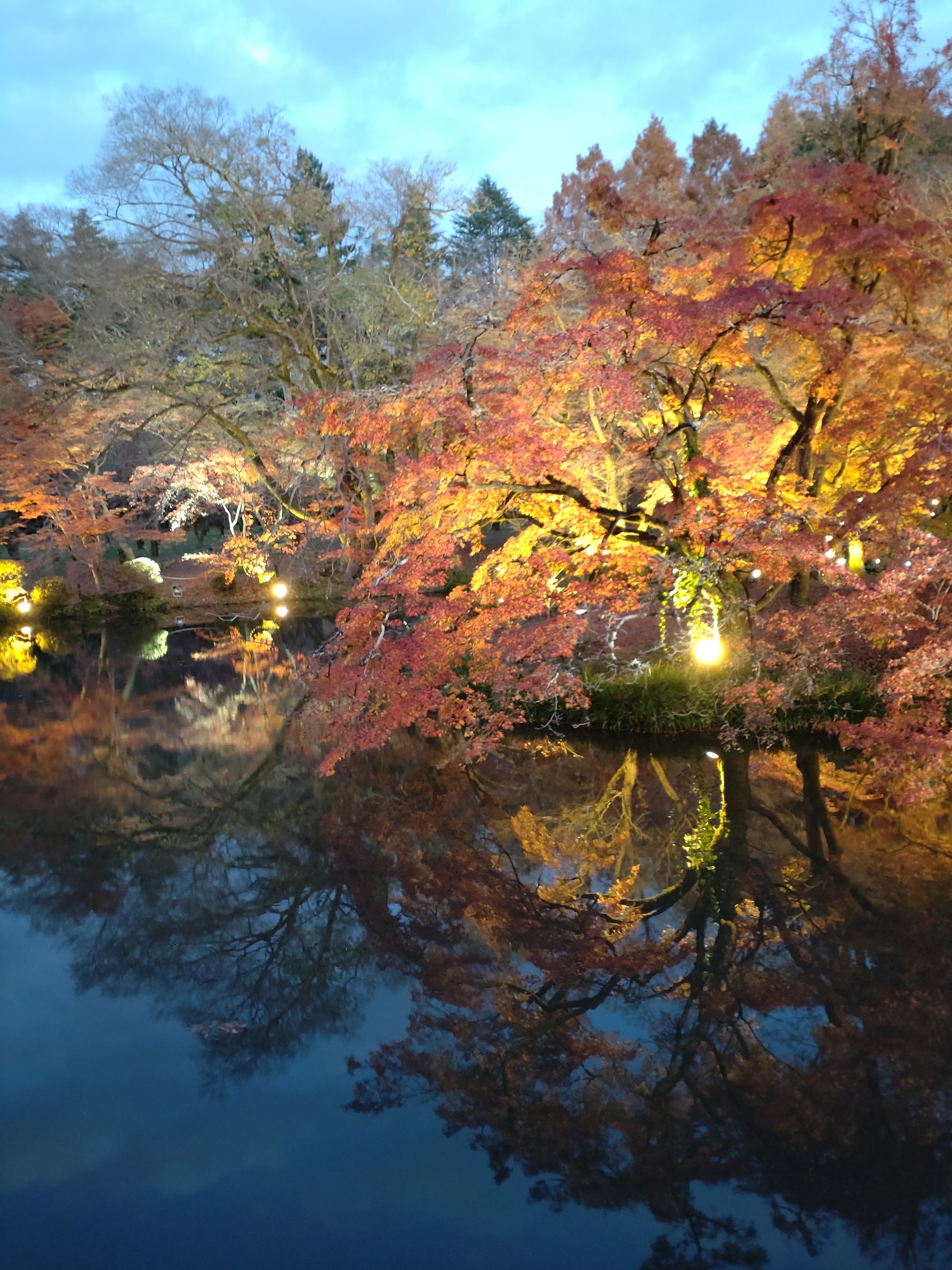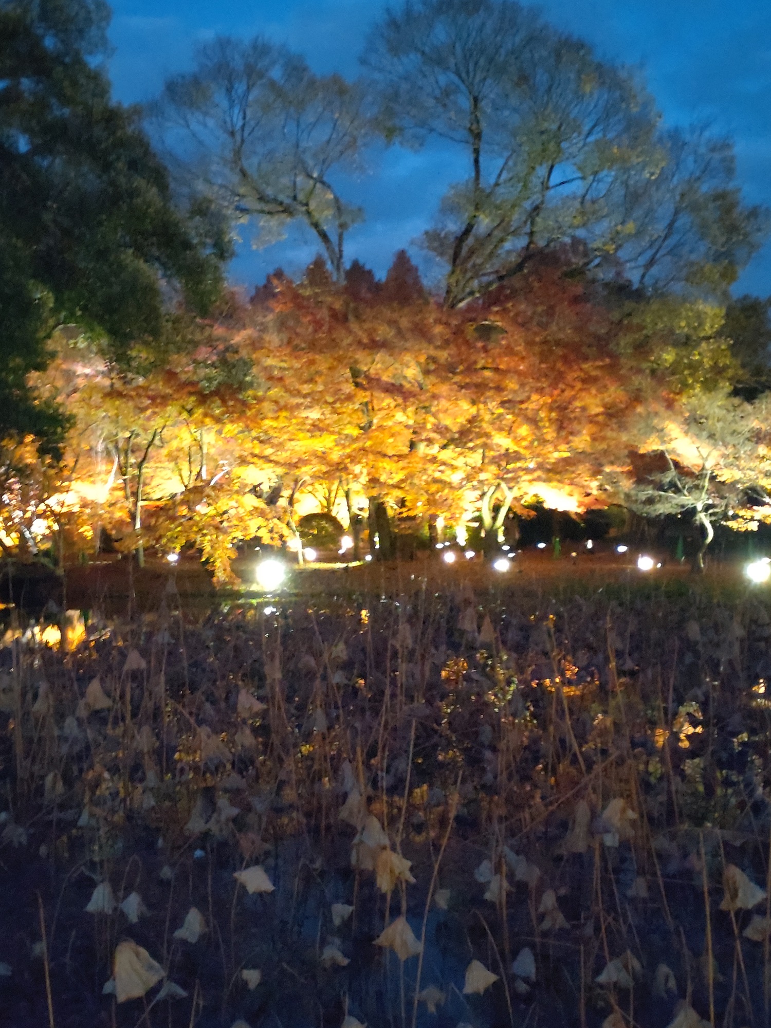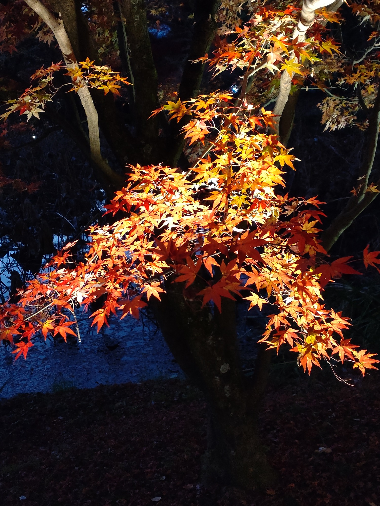 ライトアップの紅葉は昼間の光と違う色彩感覚で好きです。水面に映るモミジ、あるいは深い闇の色に浮かび上がる色彩、闇の中の色彩にも目が奪われます。府立植物園では昼も撮影しましたが、今回は割愛です。