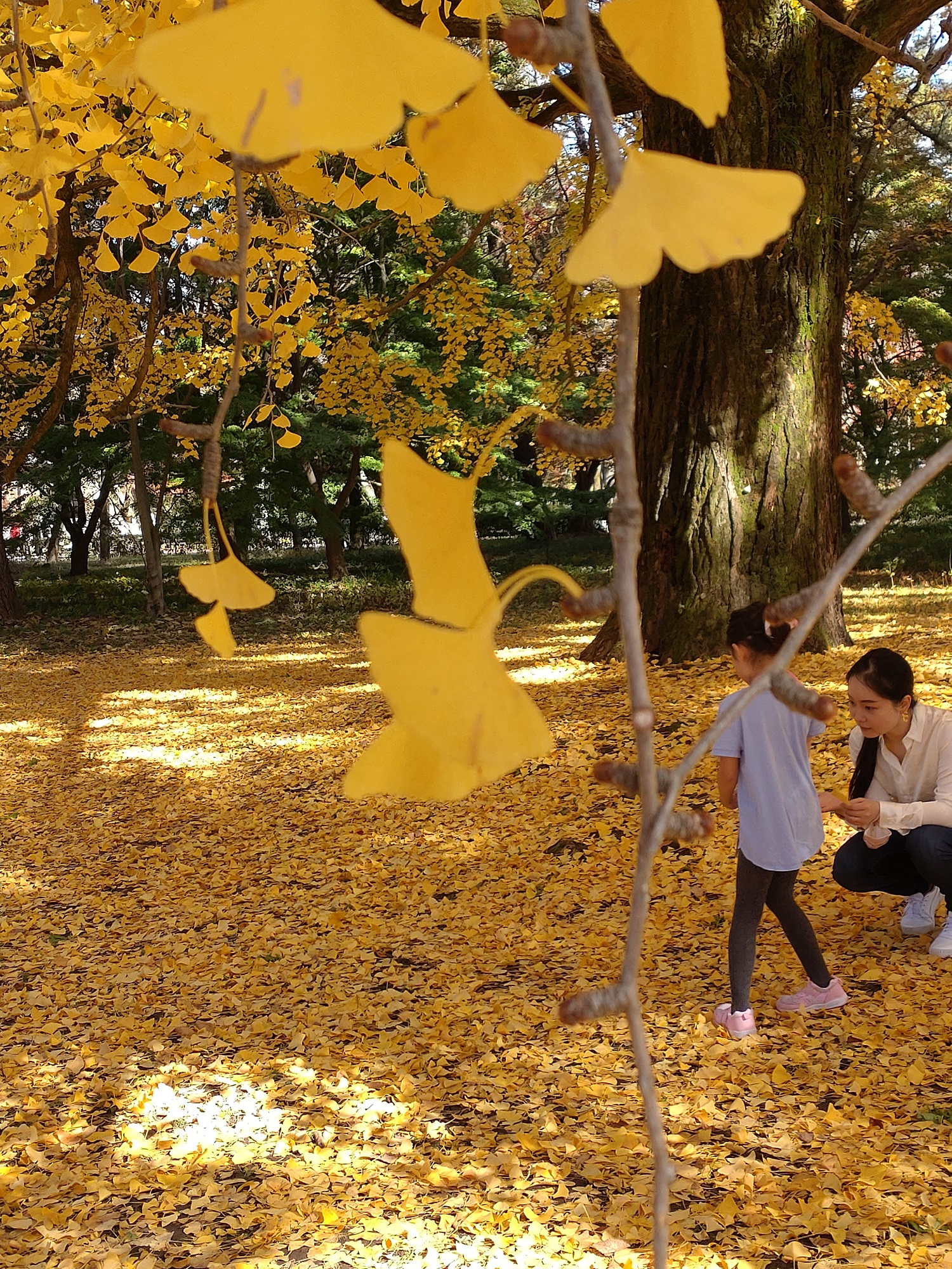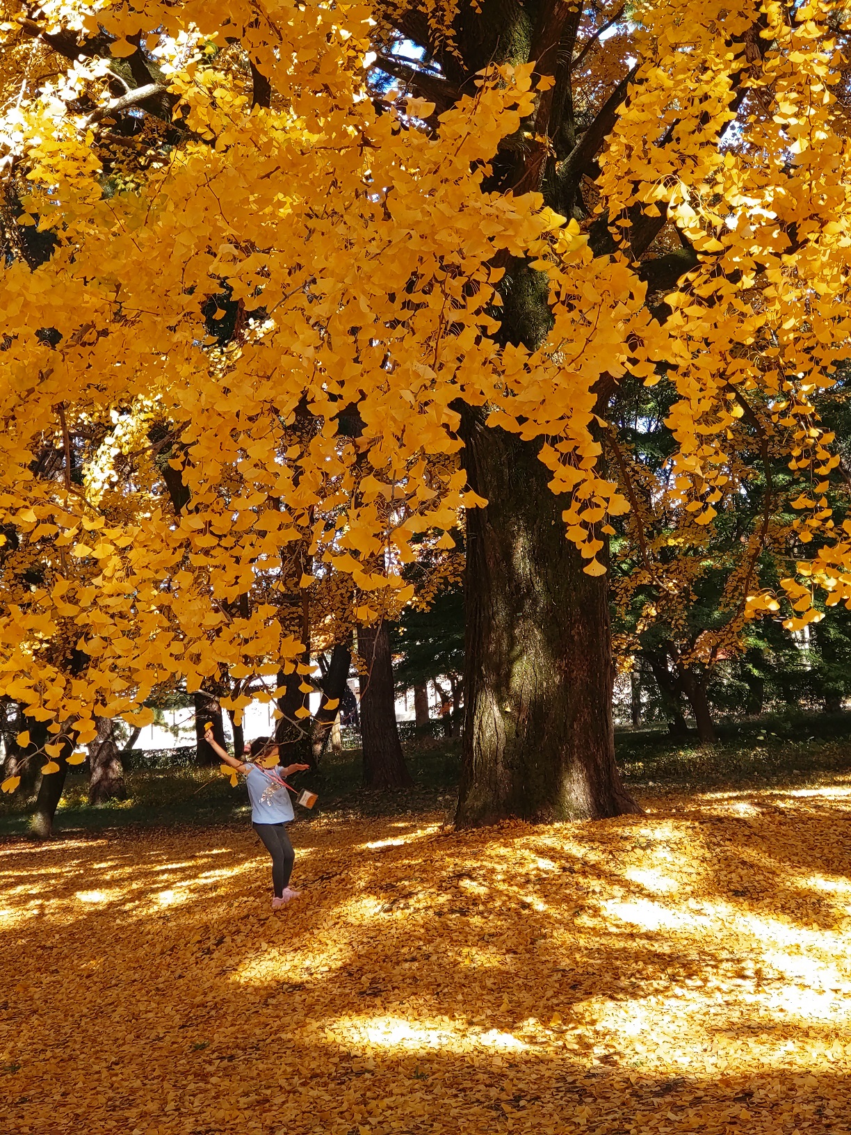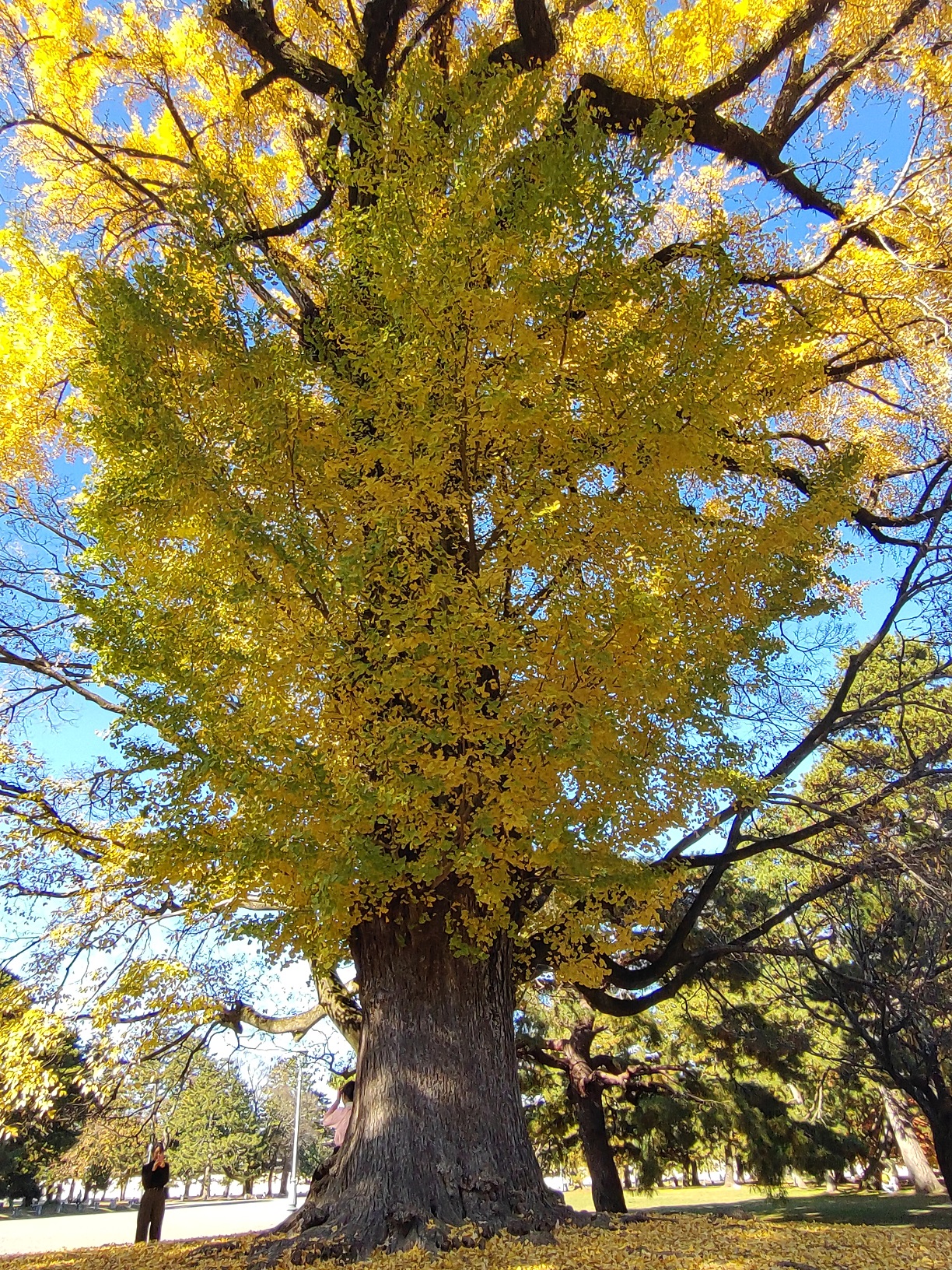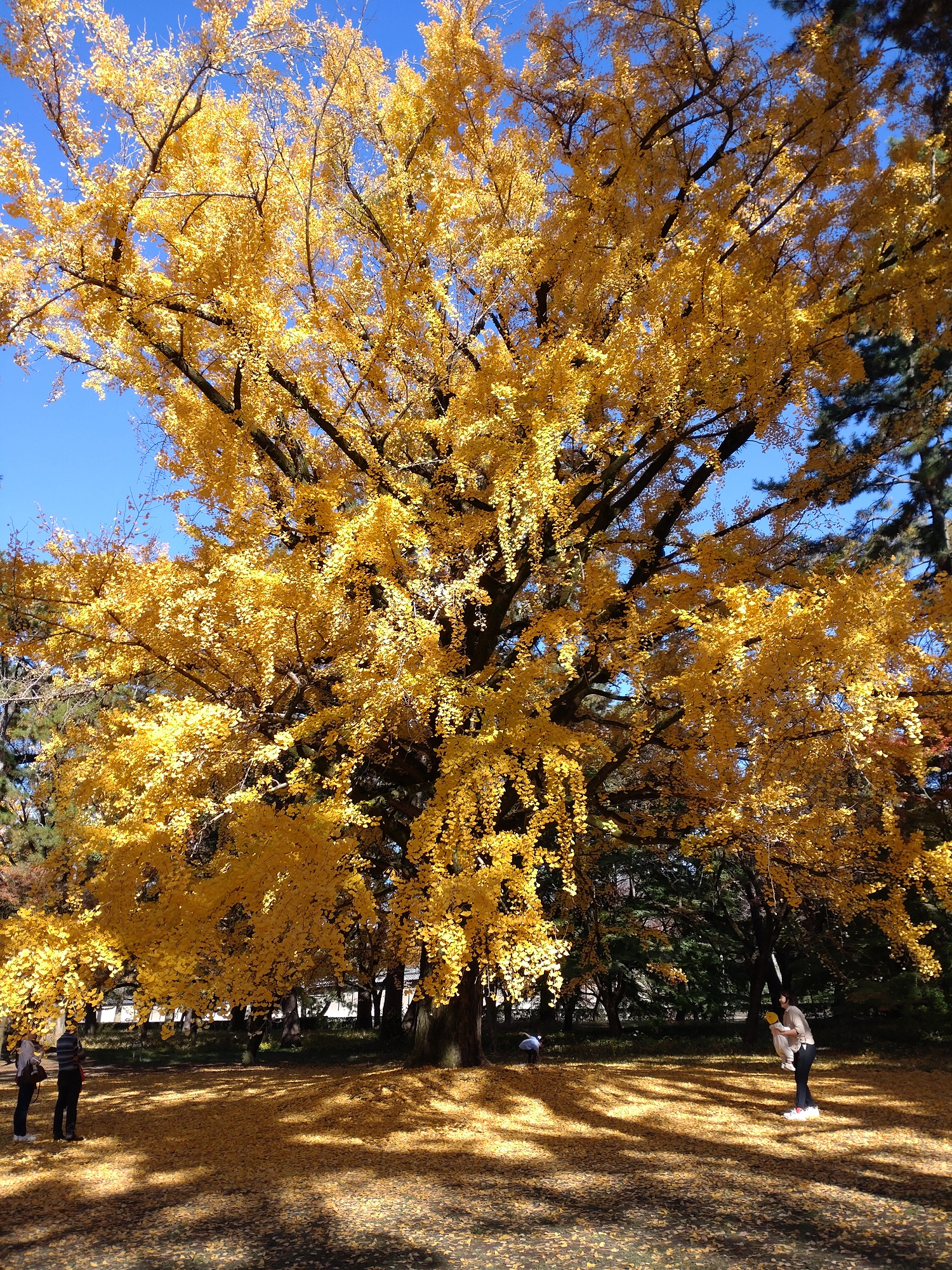 御所には大イチョウがいくつもあります。御所東南、学習院跡の大イチョウが今回の狙い目です。巨木の樹下は広い面積が黄色い絨毯でふかふか、メルヘンの世界です。観光客が少ないので煩わしさがありません。凝華洞跡にもっと高い大イチョウがあり、壮観ながら、おとぎ話の世界ではありません。