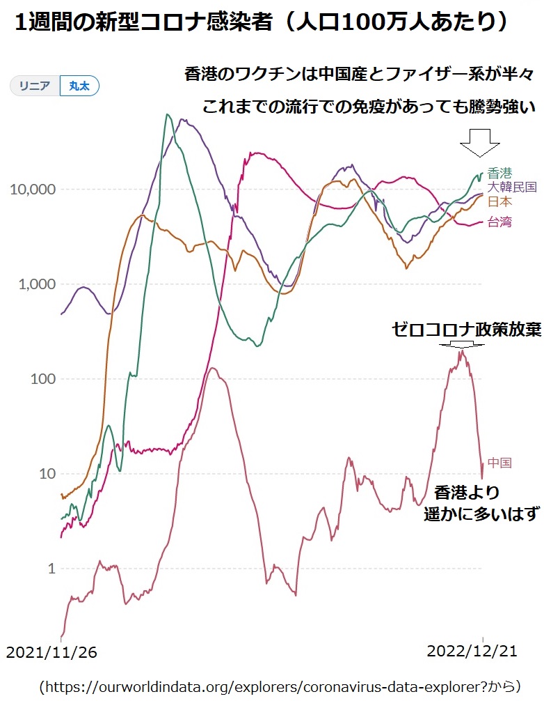 東アジア各国の過去1年間、人口100万人あたり、1週間の感染者数の推移グラフです。中国はゼロコロナ政策を放棄してから感染状況を把握するツールを作っていないので下がる一方ですが、比べたいのは最も多い香港の動きです。香港は中国産ワクチンとファイザー同等ワクチンがほぼ半々で接種され、海外ワクチン拒否の中国より条件は良いのに21日現在で「1週間の感染者14944」を記録、さらに騰勢です。日本は「8726」です。香港はこれまでの流行でそれなりの免疫が住民に出来ているはずなのに、感染処女地に近い中国はそれもありません。感染の実態は香港をはるかに上回って当然です。