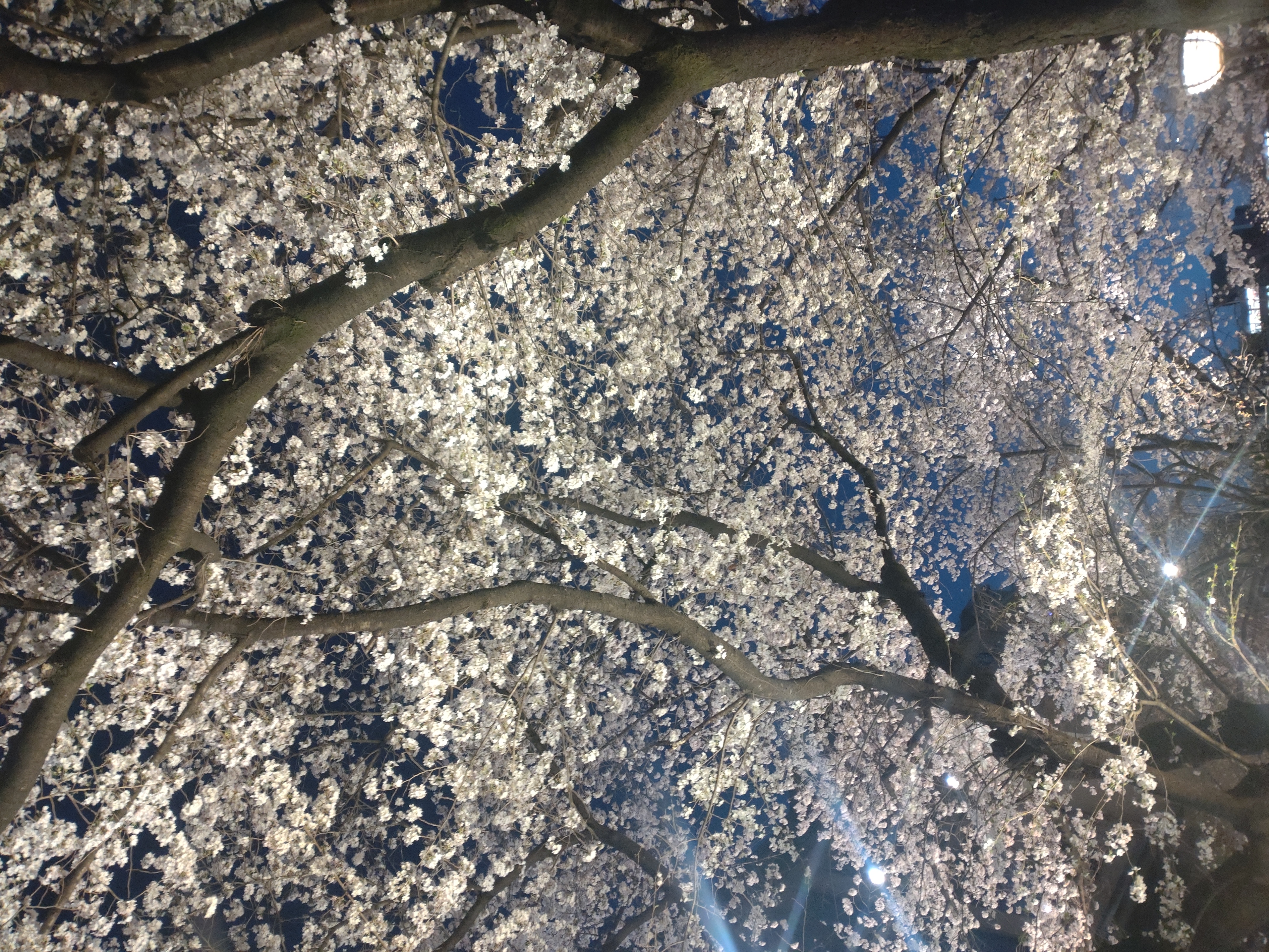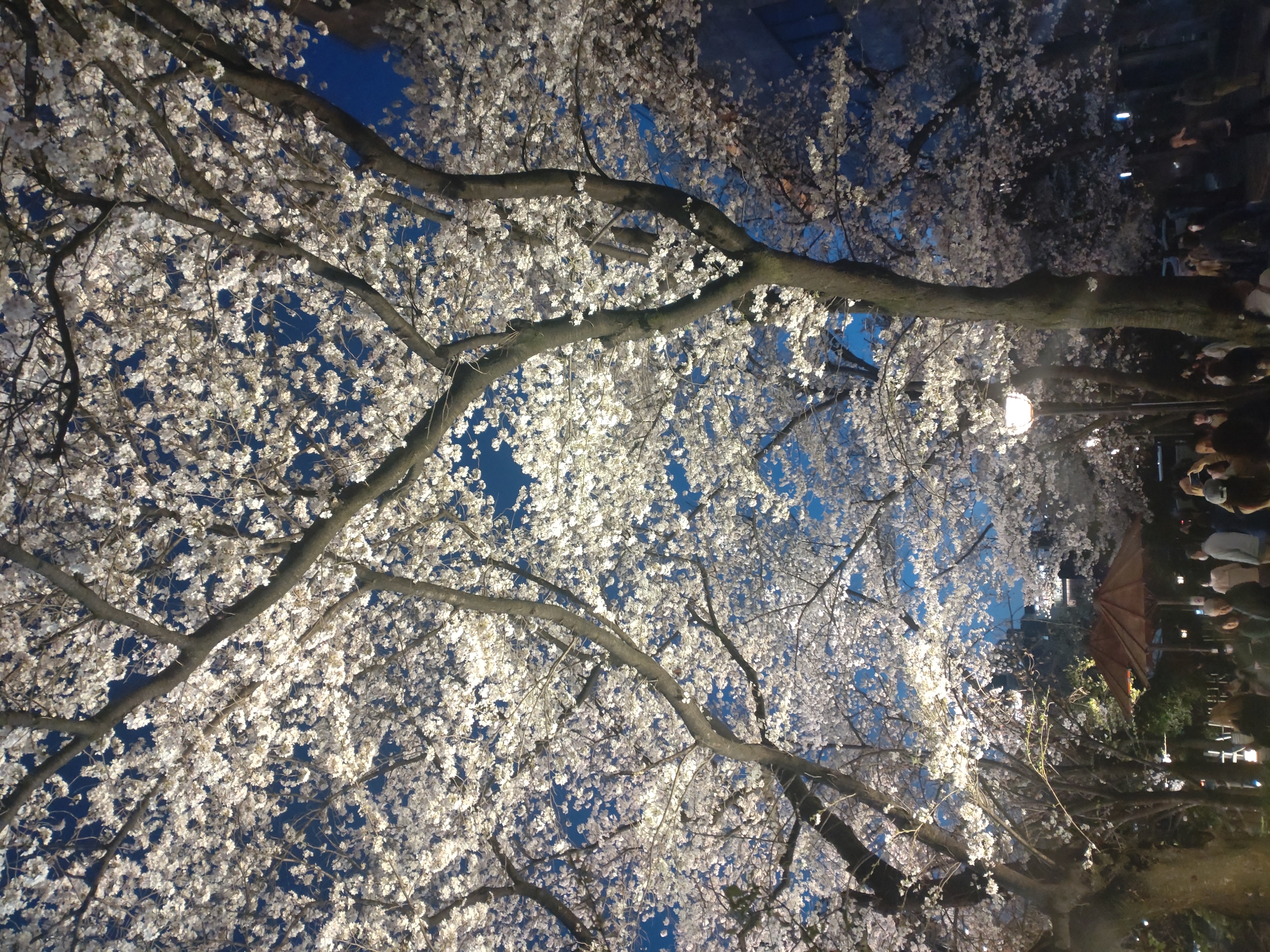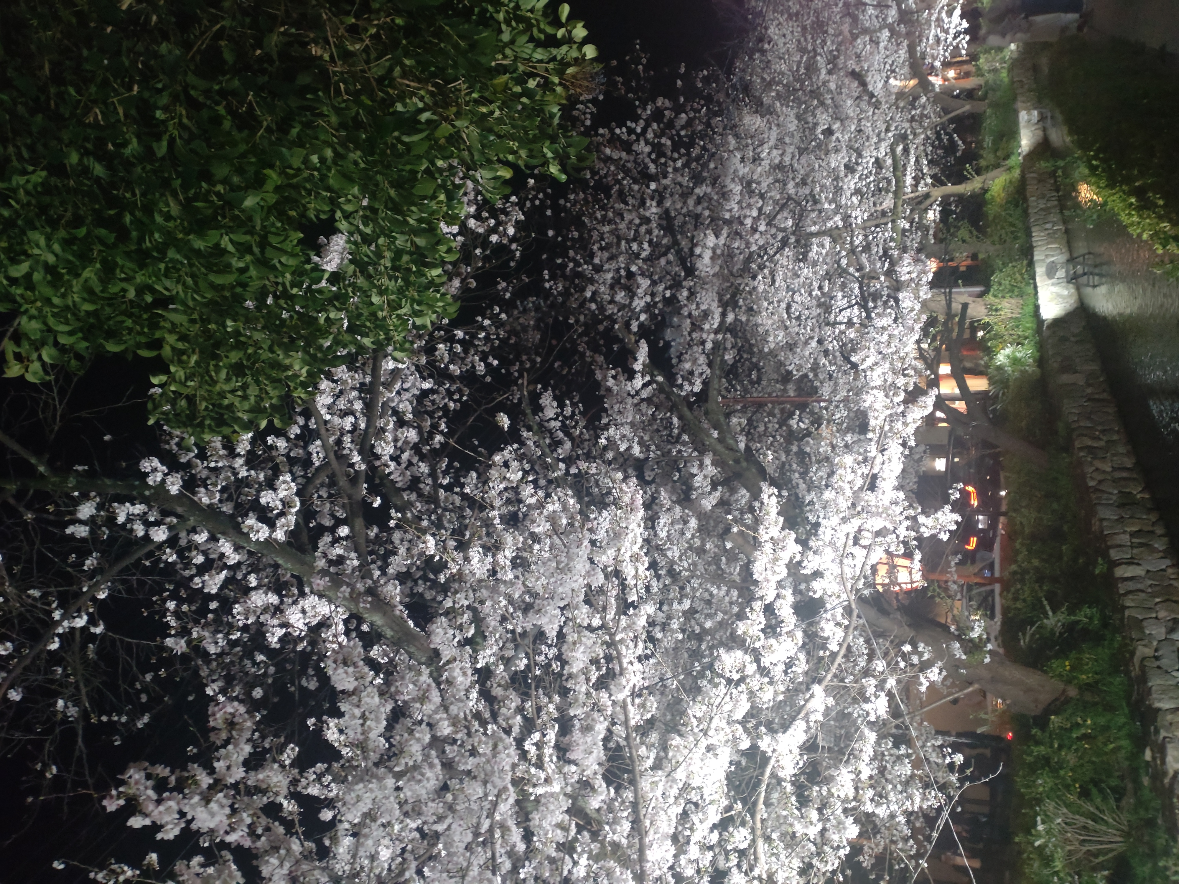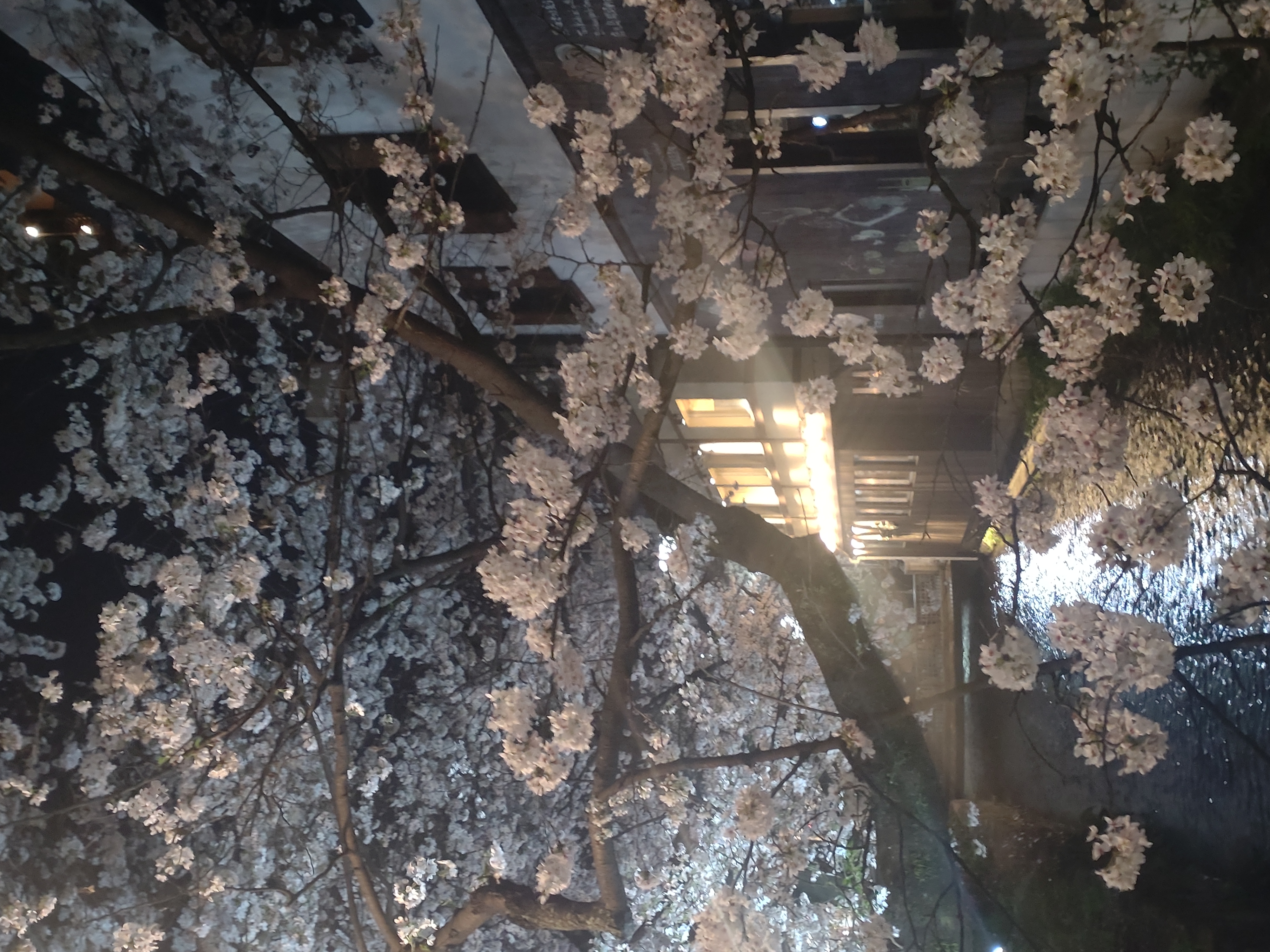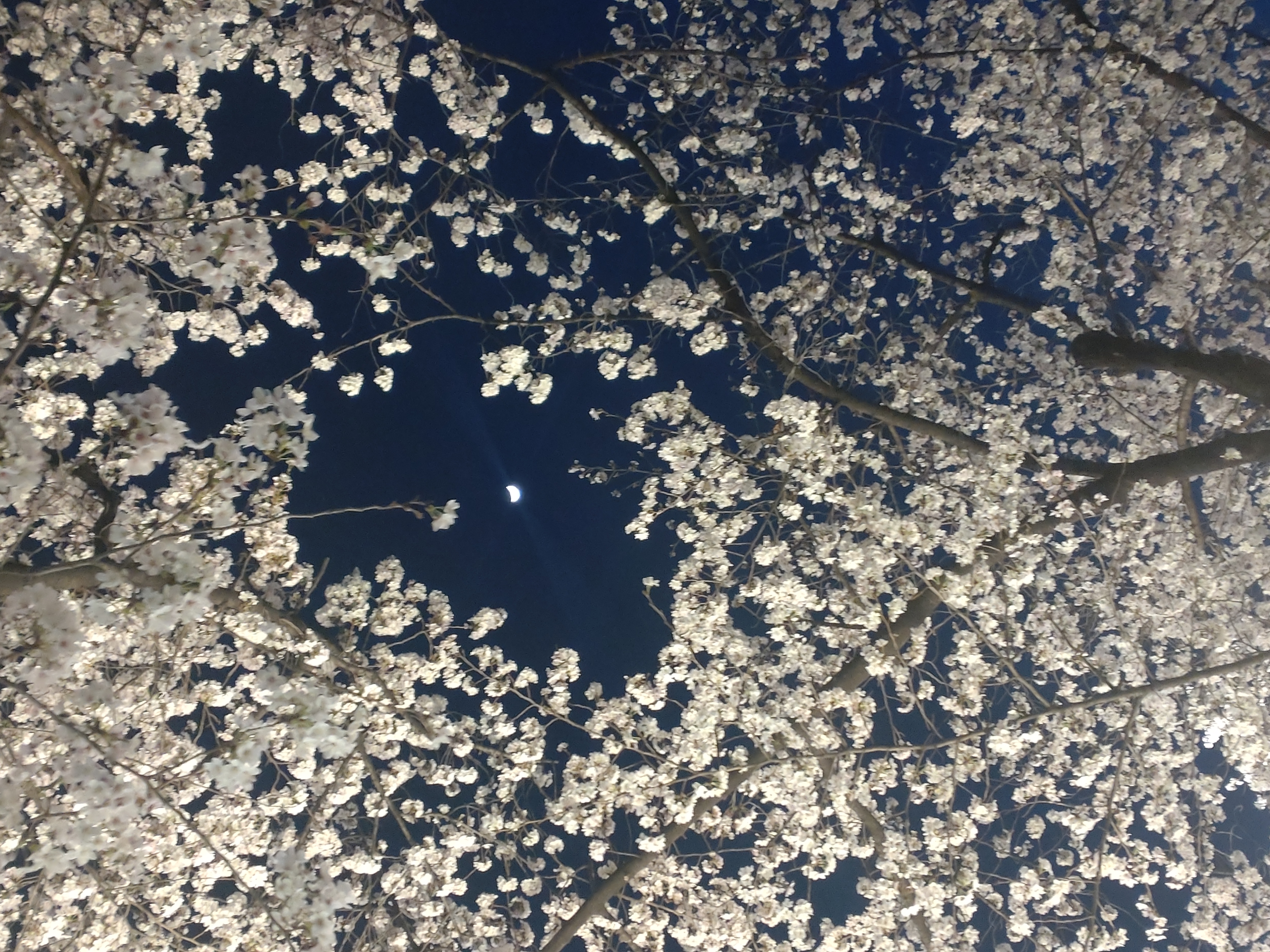 祇園白川のゴール地点、下からライトアップしているので昼間よりサクラの数がさらに多く感じます。ほとんど「サクラ天井」状態。そのすき間に三日月を見つけました。