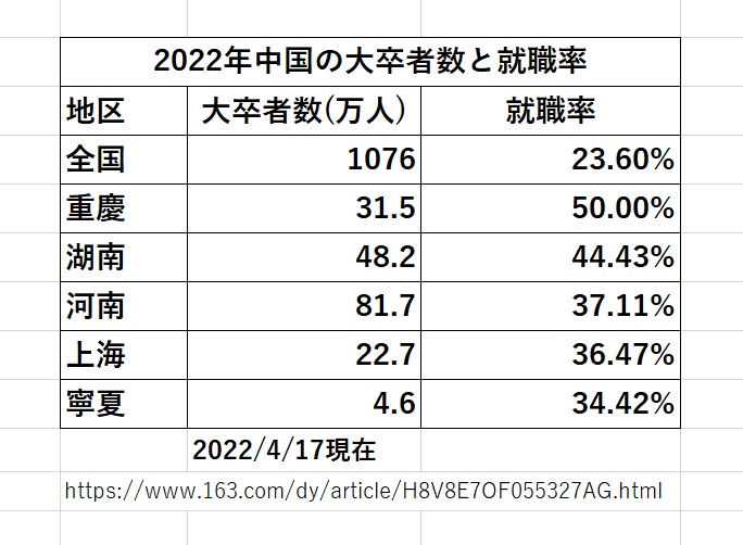 なお、中国の大学では企業や官庁との就職契約書と引き換えに卒業証書が渡されるとかで、かつては契約書の偽造や、最近では「フリーランス」労働者や「ゆるやかな雇用」とかを称しているようです。これは実質的な失業状態です。大学側は政府に向かっては就職率95%とかを上げているので実態は見えなくなります。