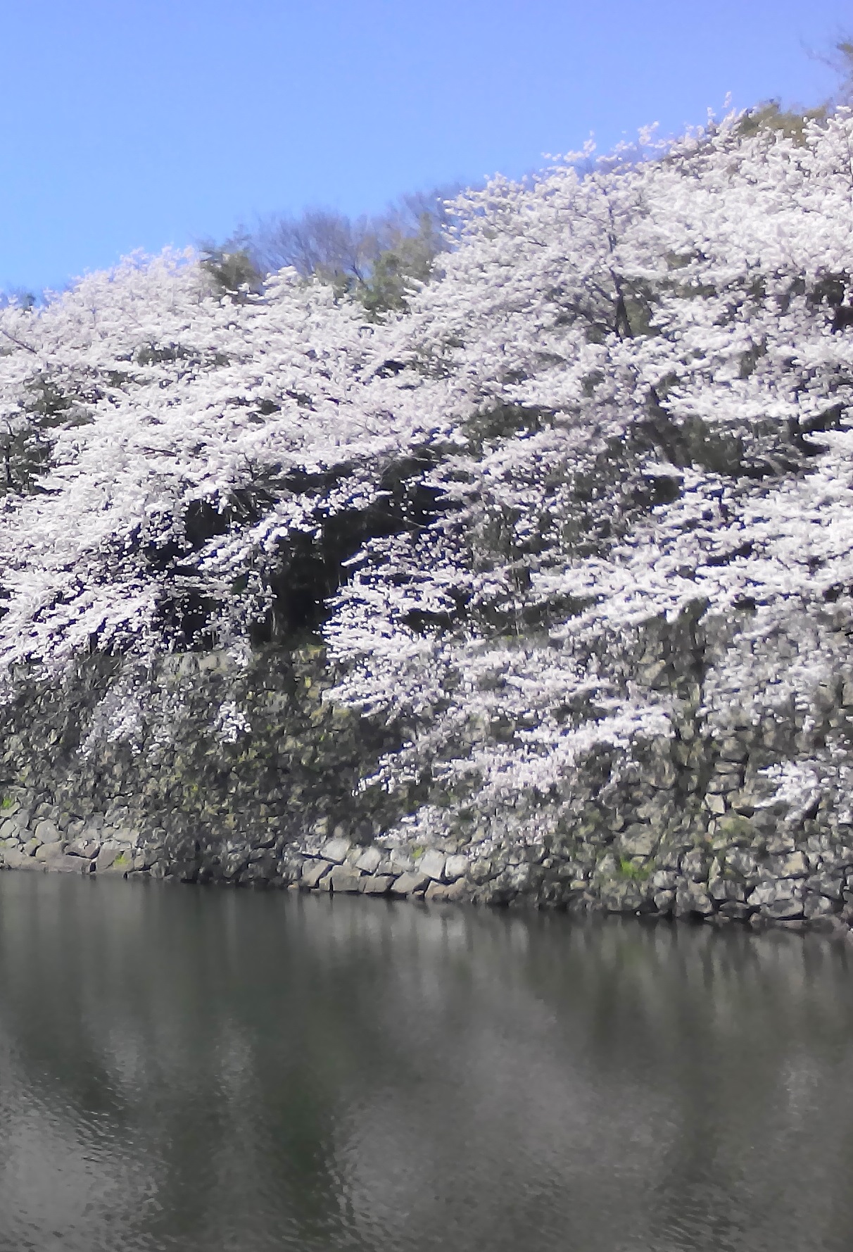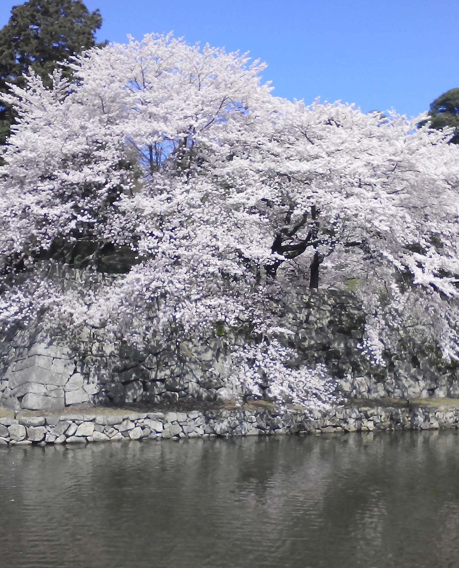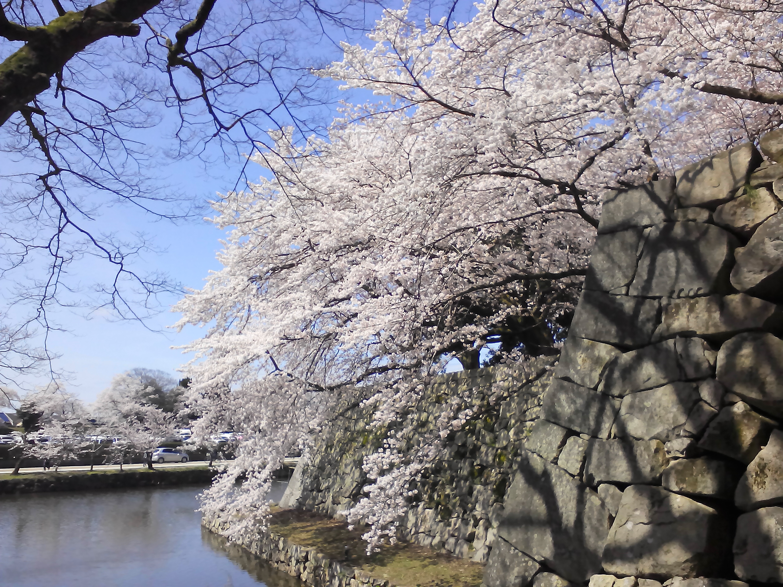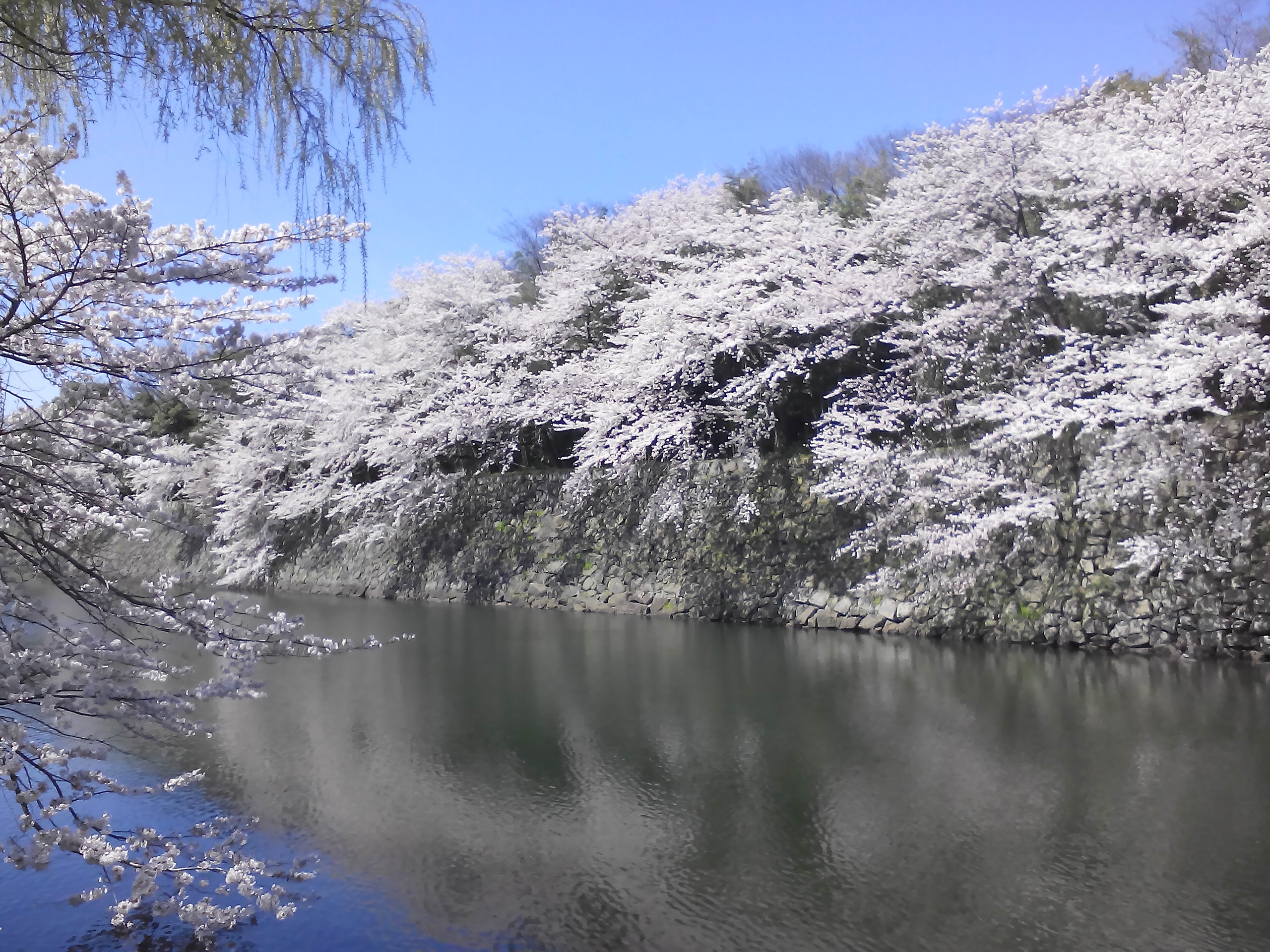 2015年4月4日の撮影分から4枚。彦根城は徳川幕府が西国大名を抑える最重要拠点でしたから、石垣や堀の造りも半端ではありません。台風前に存在した白く輝く桜の壁は比類ない美しさでした。接近して観察すると、何層にも桜が植えられています。その結果、滝のようなカスケードになります。