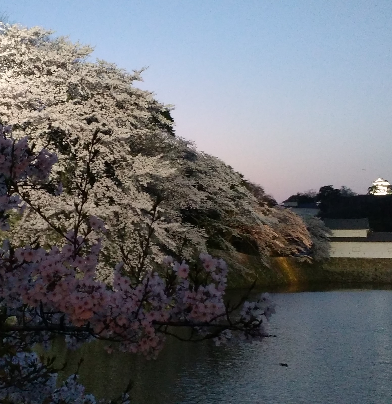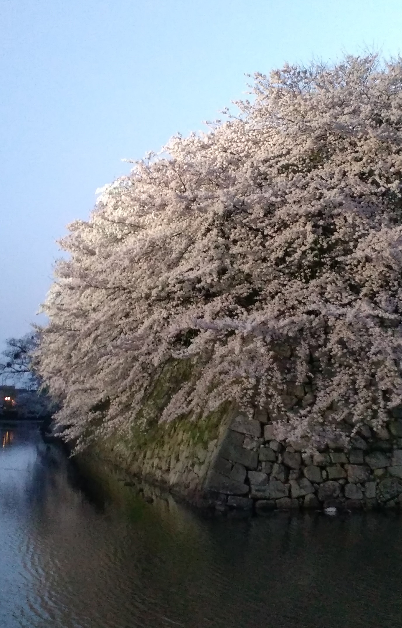 2018年は4月3日の薄暮、ライトアップ撮影4枚で、本来は真っ白な桜がほんのり色付きます。また、昼間は太陽光で照らされなかった影部分のサクラも照明されるのでボリュームアップして見えます。石垣の角になっている場所は一段、高い所から下へ桜が植えられているので、カスケード感が強く出ます。