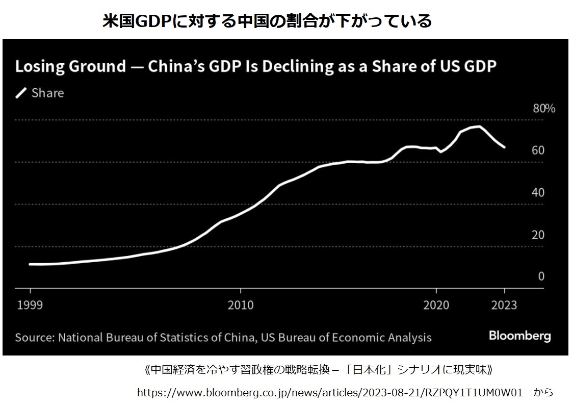 中国に対する外国からの投資が激減、輸出入ともに縮小し、物価が下がり始めてデフレ入りが言われ、不動産バブル崩壊による信用不安が拡大、新卒者中心に若者多数が就職難に喘ぐ――これほどの経済大変調の波が一斉に押し寄せているのに、中国政府は政策的不作為を決め込んでいるように見えます。僅かな利下げや自社株買いの強制、株式の売り越しを防いでも、起きている危機の規模に対応しておらず役に立ちません。Bloombergの21日付《中国経済を冷やす習政権の戦略転換−「日本化」シナリオに現実味》から米国GDPに比べて中国GDPが大きく下がり始めたグラフを引用します。