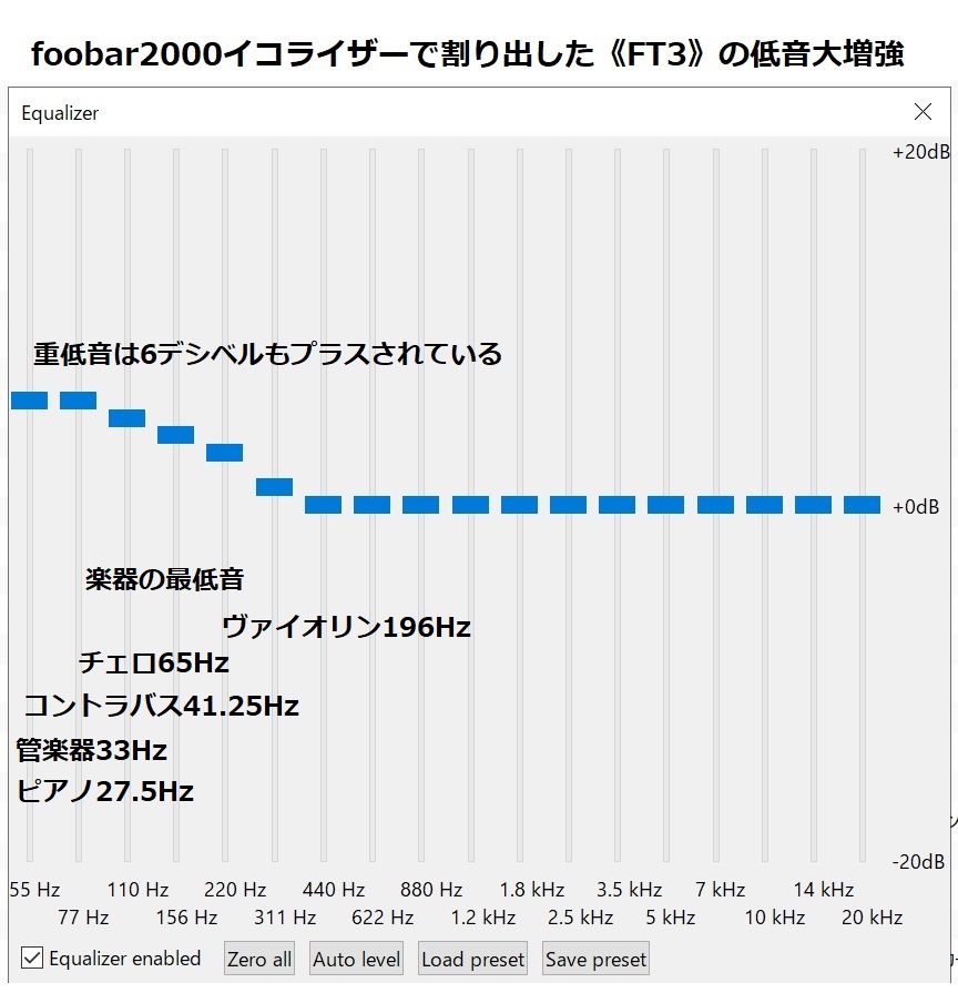 アプリ「foobar2000」のイコライザーを使って、《FT3》と低音域の音色感が似ている独ベイヤーダイナミックのモニターヘッドフォン《DT1990PRO》とで聴き比べ、再生特性を割り出しました。バイオリンにはほぼ影響しない300ヘルツ以下の低音域で増強され始め、重低音域に向かうほど増えて最高6デシベルは上がっている感じです。映画音響の迫力化は試すと歴然です。
