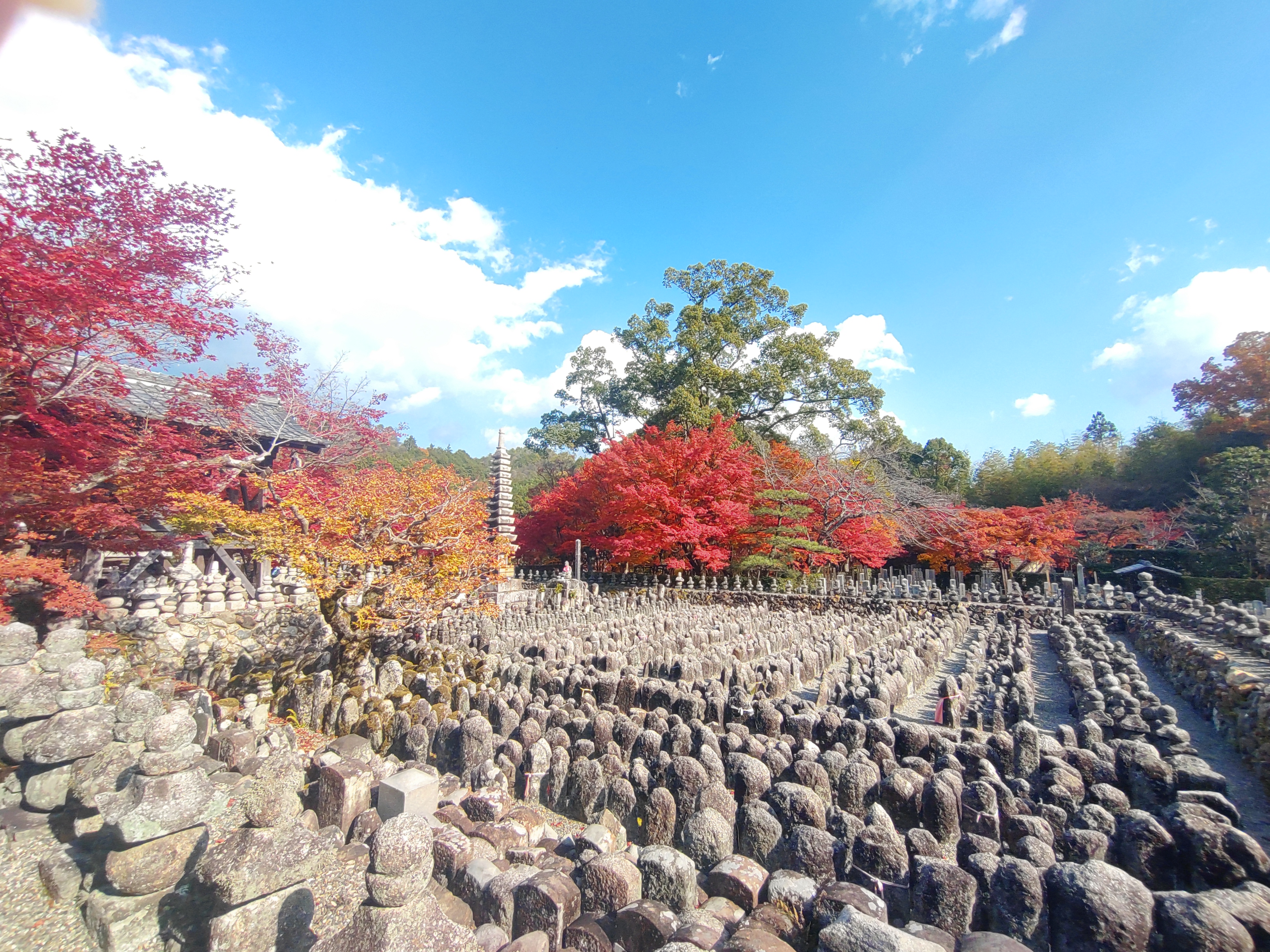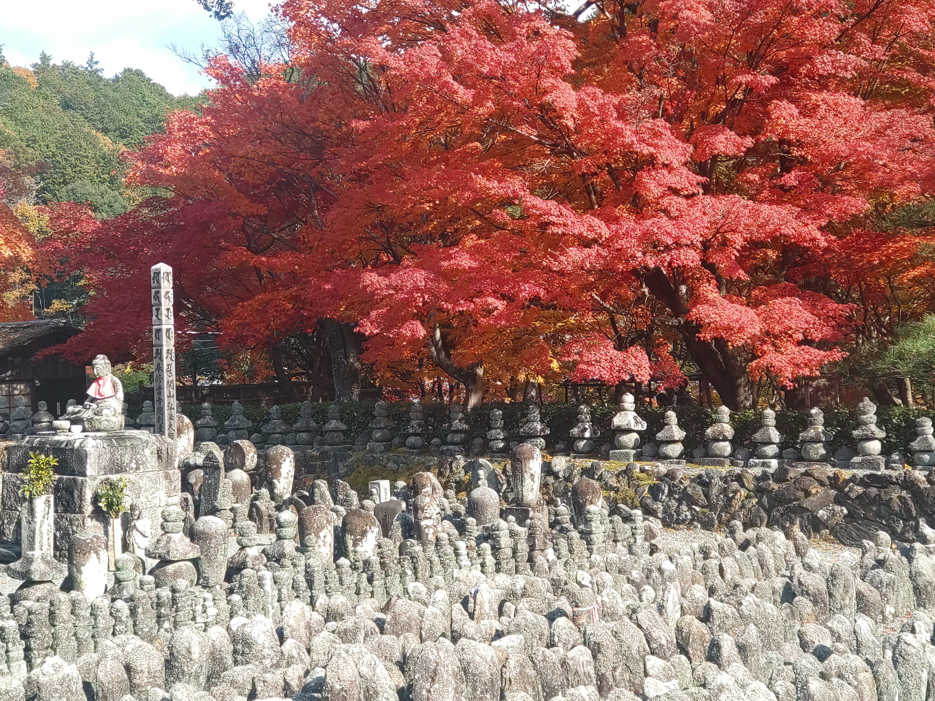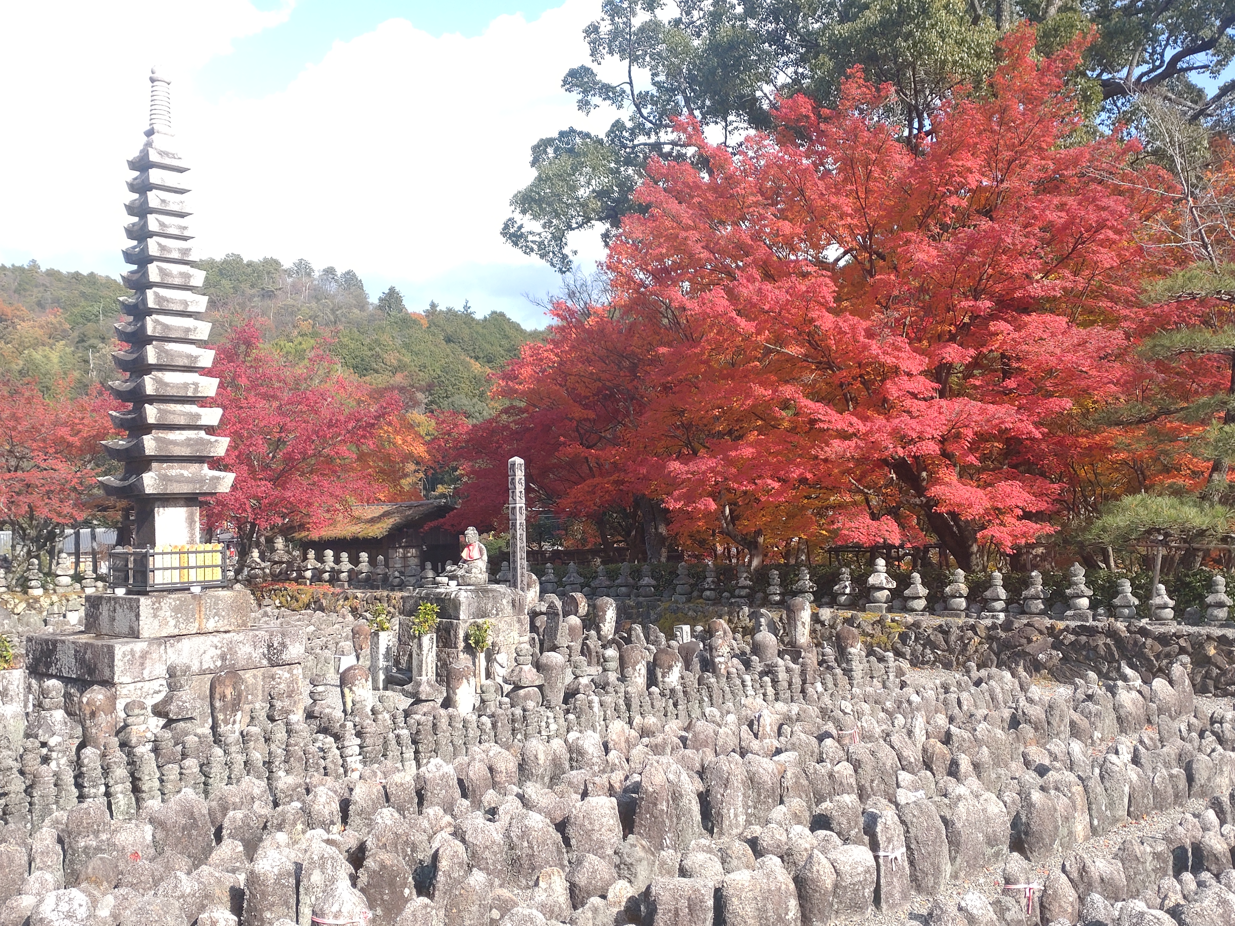 鳥居本バス停で降りて鮮やかな紅葉をスケッチしながら、散りモミジ敷く化野念仏寺の入り口坂道へ。1200年前に弘法大師が五智山如来寺として開創、その後、法然上人の常念仏道場になりました。