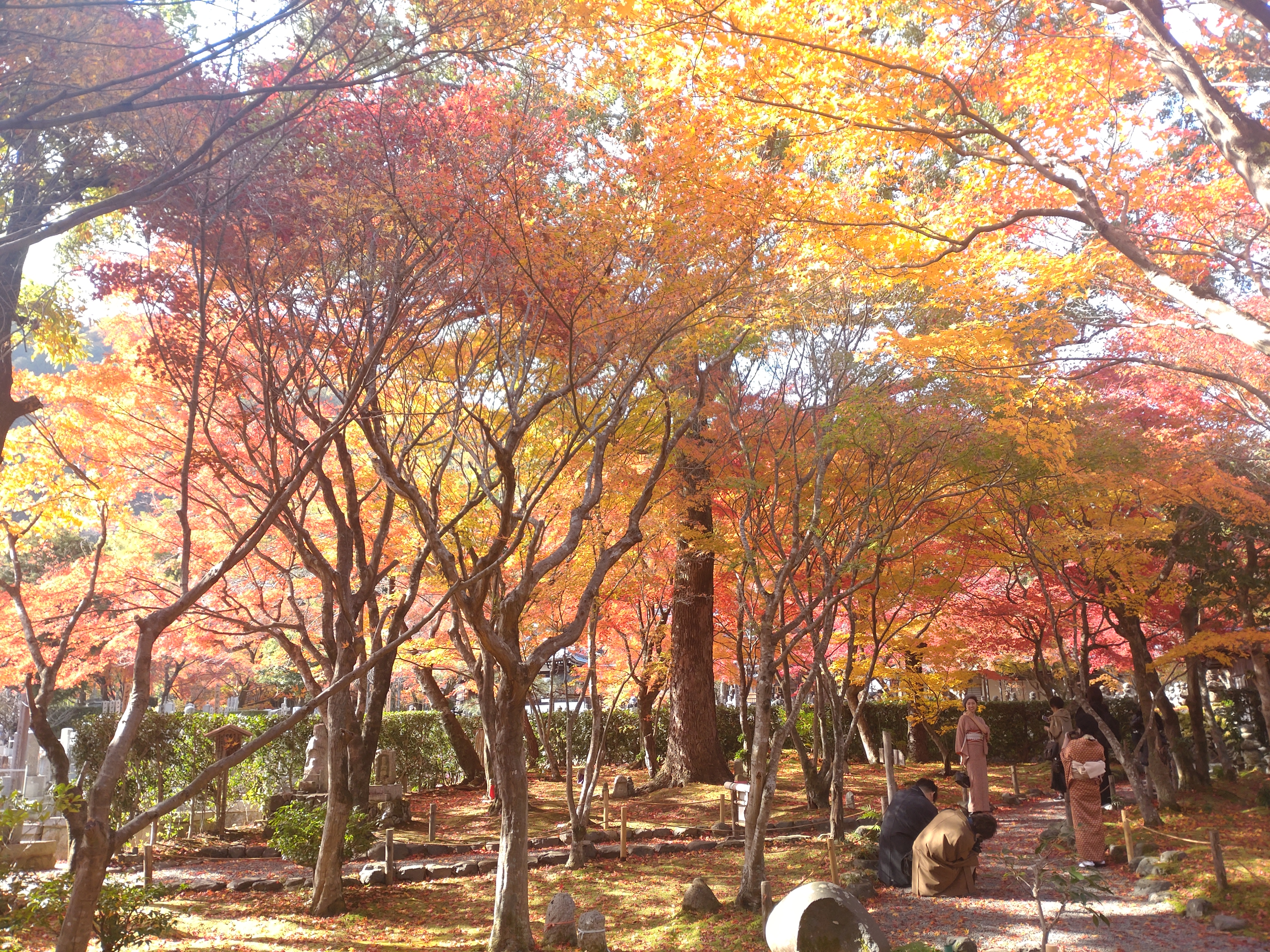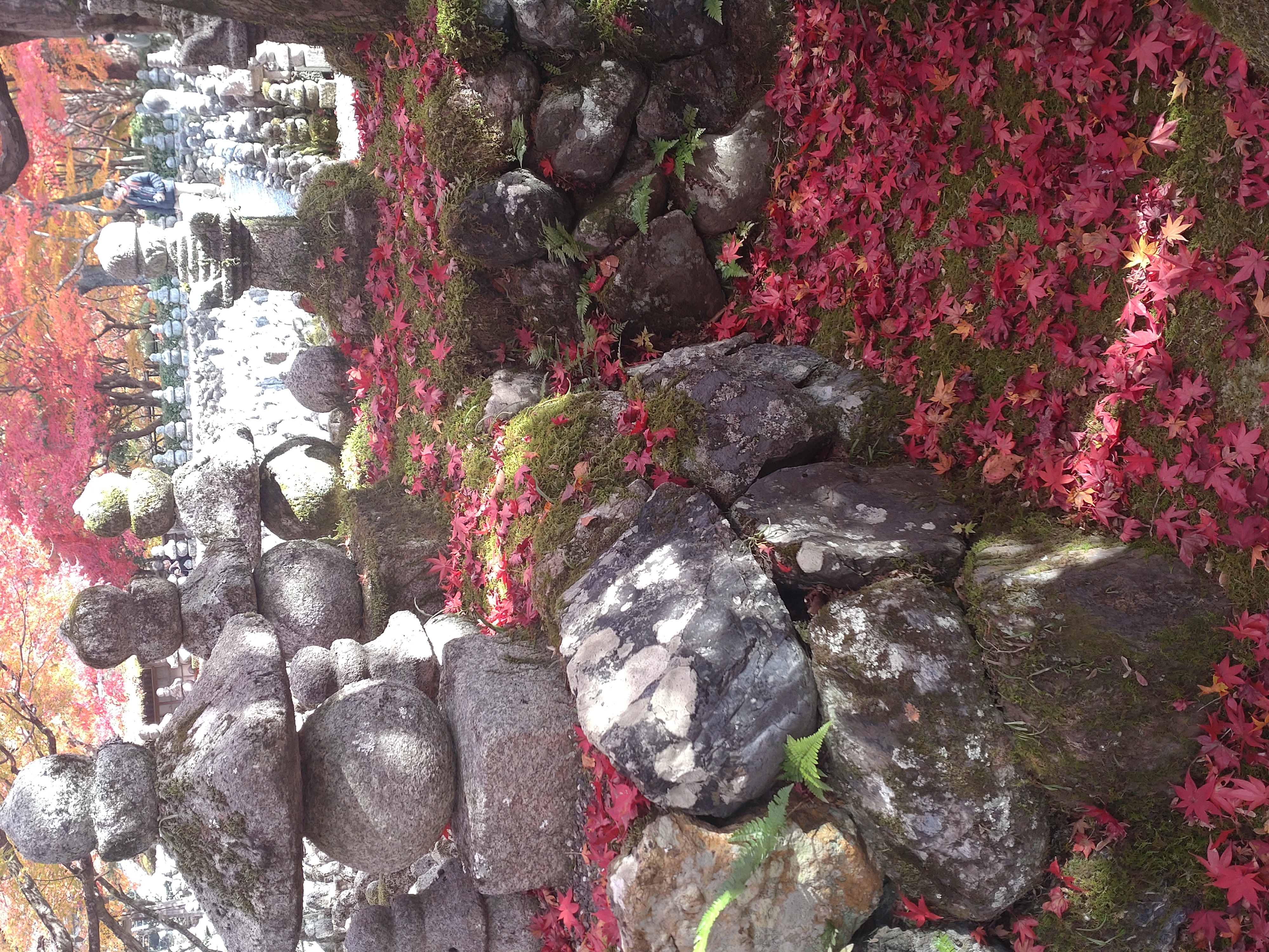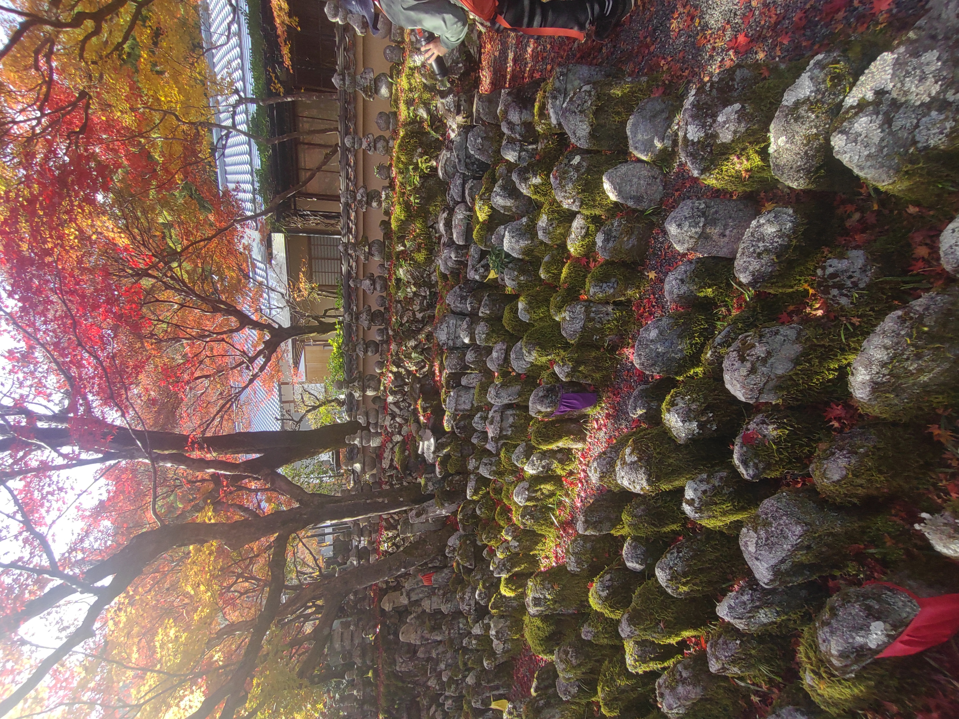 鳥居本バス停で降りて鮮やかな紅葉をスケッチしながら、散りモミジ敷く化野念仏寺の入り口坂道へ。1200年前に弘法大師が五智山如来寺として開創、その後、法然上人の常念仏道場になりました。