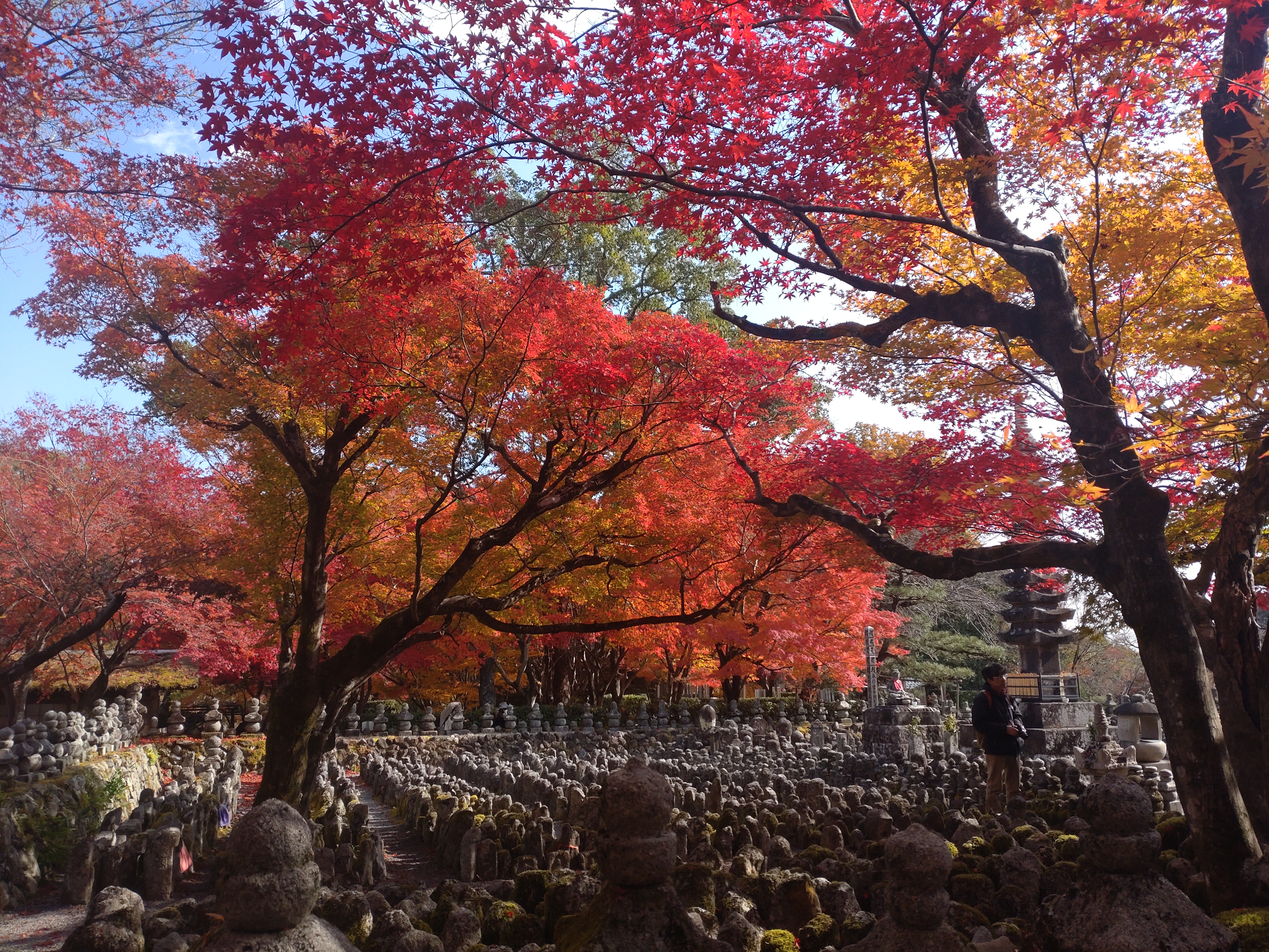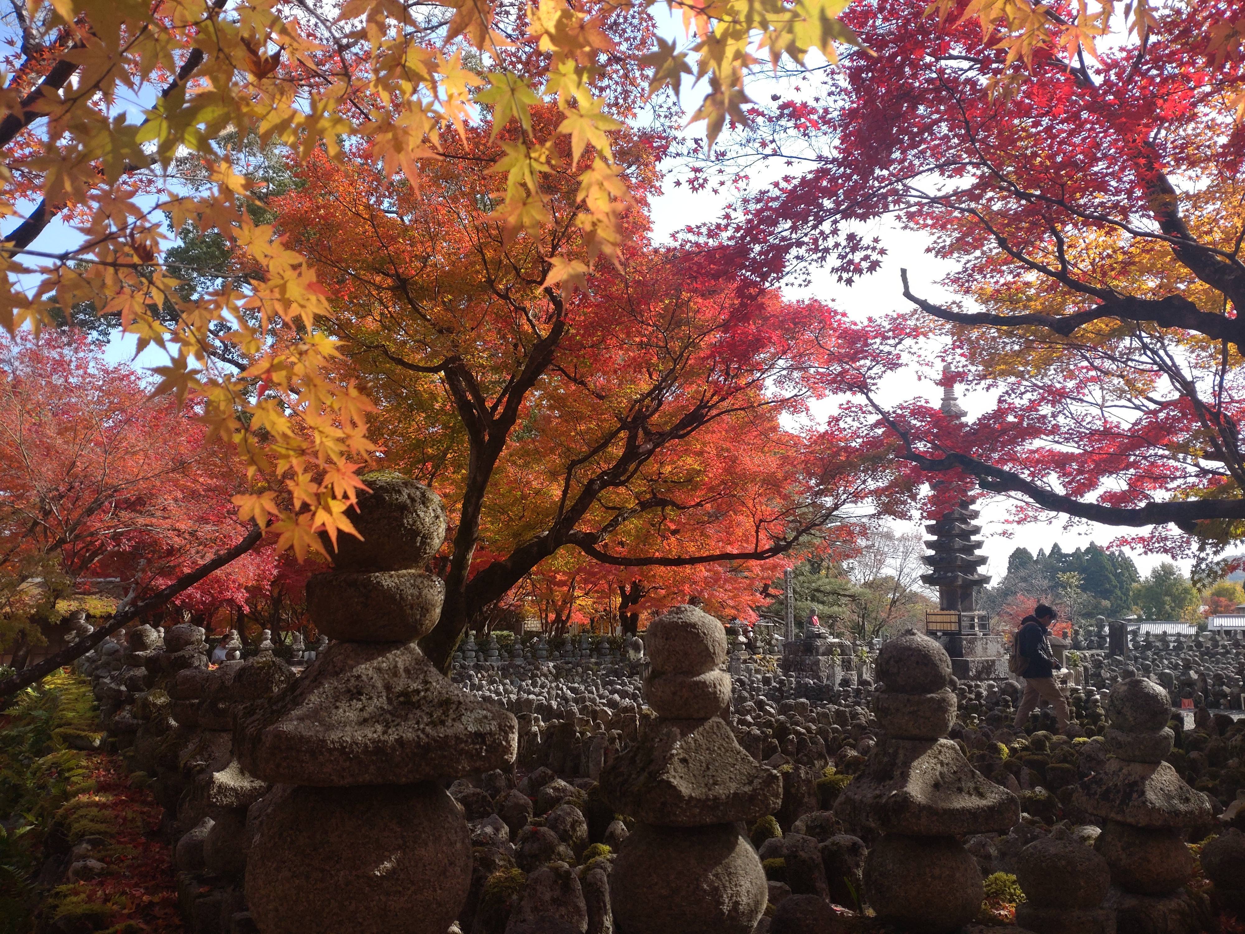 秋の京都は紅葉。外国人観光客が多数詰めかけている東山の永観堂、南禅寺、清水寺は言うまでもなく、西の嵯峨野でも嵐山界隈は連日ニュースに出る混雑具合です。ふとひらめいたのが嵯峨野の奥、化野(あだしの)念仏寺が注目から外れている点、しかし写真には良いスポットです。阪急嵐山駅前から1時間1本出ている清滝行きバスで直行し、南下していくつかお寺を回りながら混んできたらそこで終わりにしようと決めて28日に出かけました。実際は道半ば予期せぬ雨になって、宝筐院(ほうきょういん)までで退却した写真スケッチ集をお届けします。