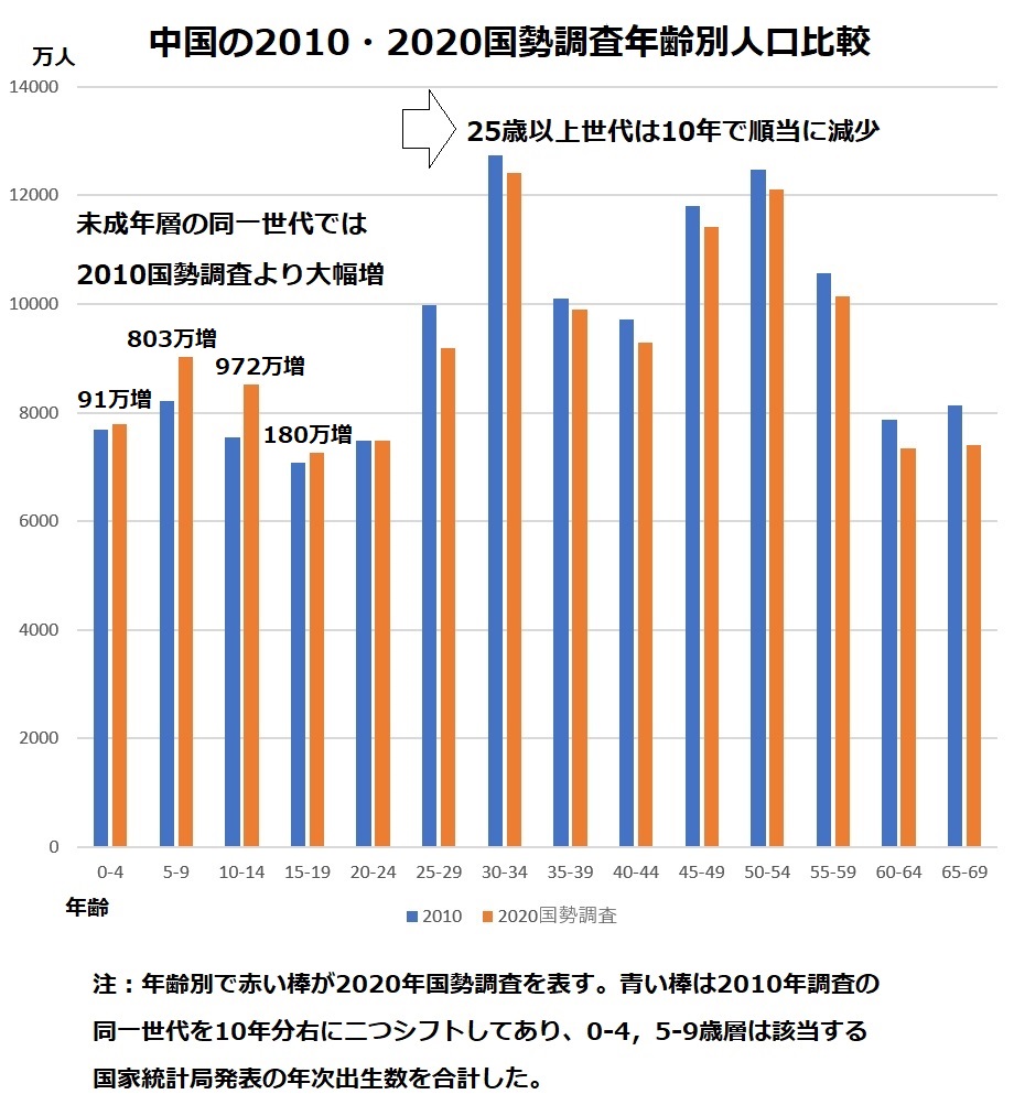 グラフの0-4歳と5-9歳で2010年に相当する部分は国家統計局発表の年次出生数を合計した数字です。2021年の発表当時は2010年調査に影響しないように10歳未満世代で捏造が行われたと考えられていました。しかし、15-19歳の世代でも180万人の増加があり、「誤差」ではあり得ません。5-9歳の803万人と0-4歳の91万人増加は年次出生数の過去に遡る見直しでごまかせる可能性はありますが、少なくとも1100万人を超える若年人口増加捏造は隠しようがありません。