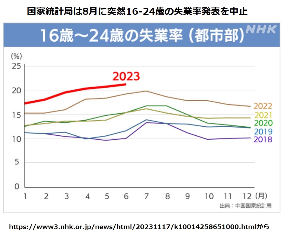 中国政府発表統計の信頼性には前々から疑問が持たれていました。NHKの11/17付《“経済失速”が叫ばれる中国 相次ぐデータ公表停止の謎》が真剣に検証する姿勢を見せ始めたのは歓迎です。きっかけは下にグラフを引用している、国家統計局が8月になって突然、16-24歳の失業率発表を中止した異常事態です。新規大卒者が毎年1000万人を超える時代に入り、内外が注目の統計でした。