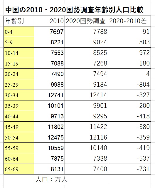 当ウェブには中国からのアクセスも多数あります。最初に掲げた「中国の2010・2020国勢調査年齢別人口比較」グラフの元になった人口データを参考までに掲げておきます。