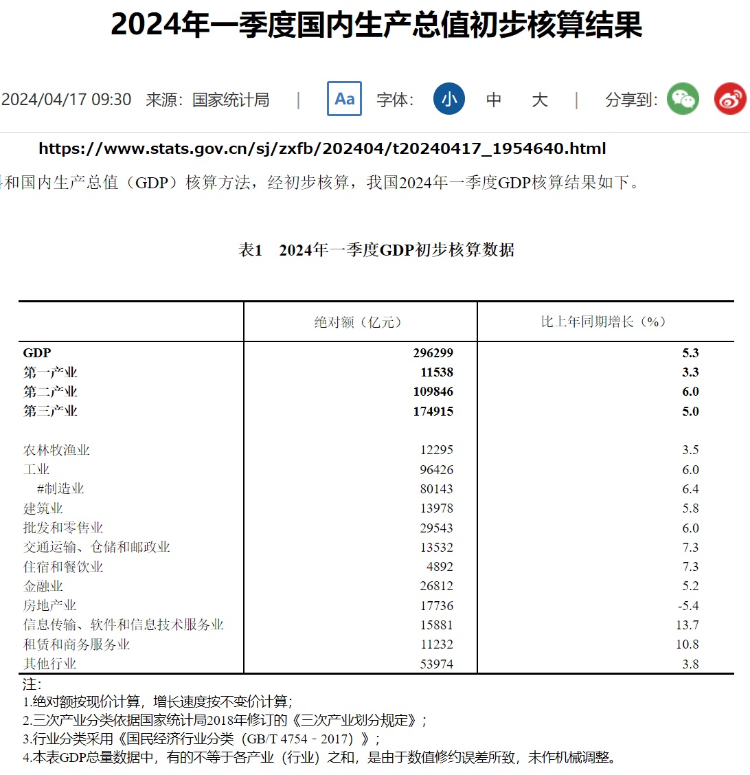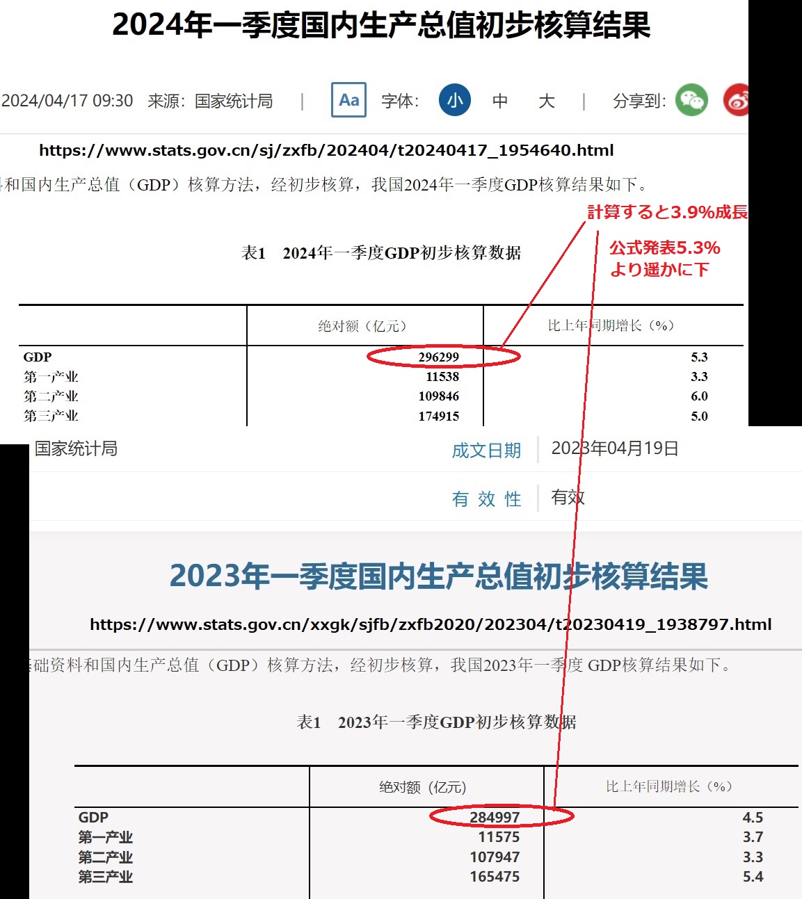 中国の国内総生産(GDP)成長率発表が信頼できないとは前々から言われてきました。日経新聞の16日付《中国、1-3月GDP5.3%増 生産・投資堅調で景気下支え》にある「5.3%増」が発表されると、不動産バブル崩壊で経済ボロボロの中国での、あり得ない高さに疑問の声噴出でした。20日付のユーチューブ《石平の中国週刊ニュース解説・4月20日号》が中国国家統計局の統計操作実態を指摘していました。過去のGDP値を勝手に下げて今が高成長だと偽装してしまうのです。国家統計局のウェブページを閲覧すると2024年の第一四半期GDP「296299億元で5.3%成長」、これに対して2023年の第一四半期GDPは「284997億元」ですから、計算するとはるかに低い「3.9%成長」でしかありません。同様に国家統計局ウェブの対応する数字で計算すると2023年のGDP成長率は「4.6%」であり、李強首相が発表した「5.2%」は高成長偽装です。
