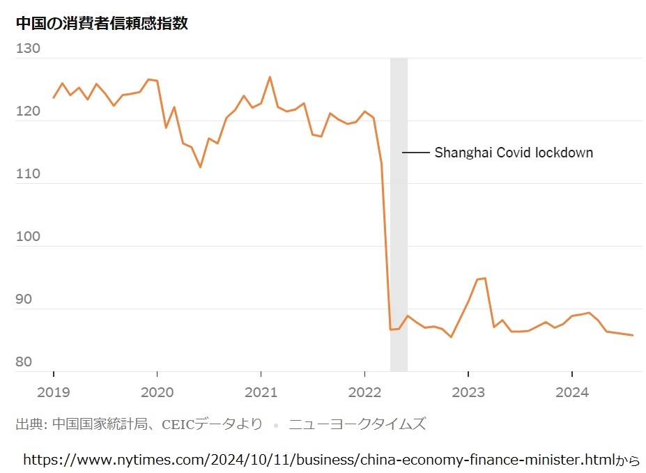 《2022年春、上海では新型コロナウイルス対策で2か月間ロックダウンが実施されたが、その間に消費者信頼感は急落し、回復していない。政府が9月29日にコメントなしでオンライン上に発表した最新の公式信頼感指数は悲惨な内容だった。中国の消費者は、2022年11月を除き、1990年以降、8月の経済に対する信頼感が最も低かったことが示された》