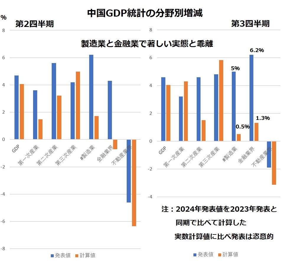 7月の第687回「中国GDP統計は現実逃避、習近平忖度で集計値無視」に続いて、国家統計局がウェブに出している前年同期の四半期GDPの数字をもとに計算した成長率と発表値を比べました。第一次、二次、三次産業別の発表値も計算値と違い過ぎて、これを信じて政策を立てれば必ず失敗するレベルです。製造業は実際の0.5%が5%と10倍、金融業は5倍の高成長を標榜しており、正気の沙汰とは思えません。(第3四半期GDP統計の詳細は、中国国家統計局ウェブでURL、2024年分と2023年分をご参照)