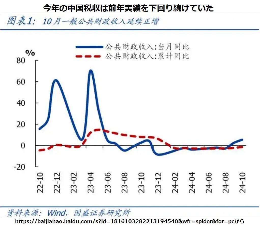 今年の税収が前年比でマイナス続きだったのに10月に初めて好転した点を誇る記事なのですが、政府発表では見つけられない税収実績のグラフを国盛証券研究所が作成しています。2023年はゼロコロナ政策解除の後で税収増がありましたが、2024年になってからはずっと前年比マイナスで推移していたのです。